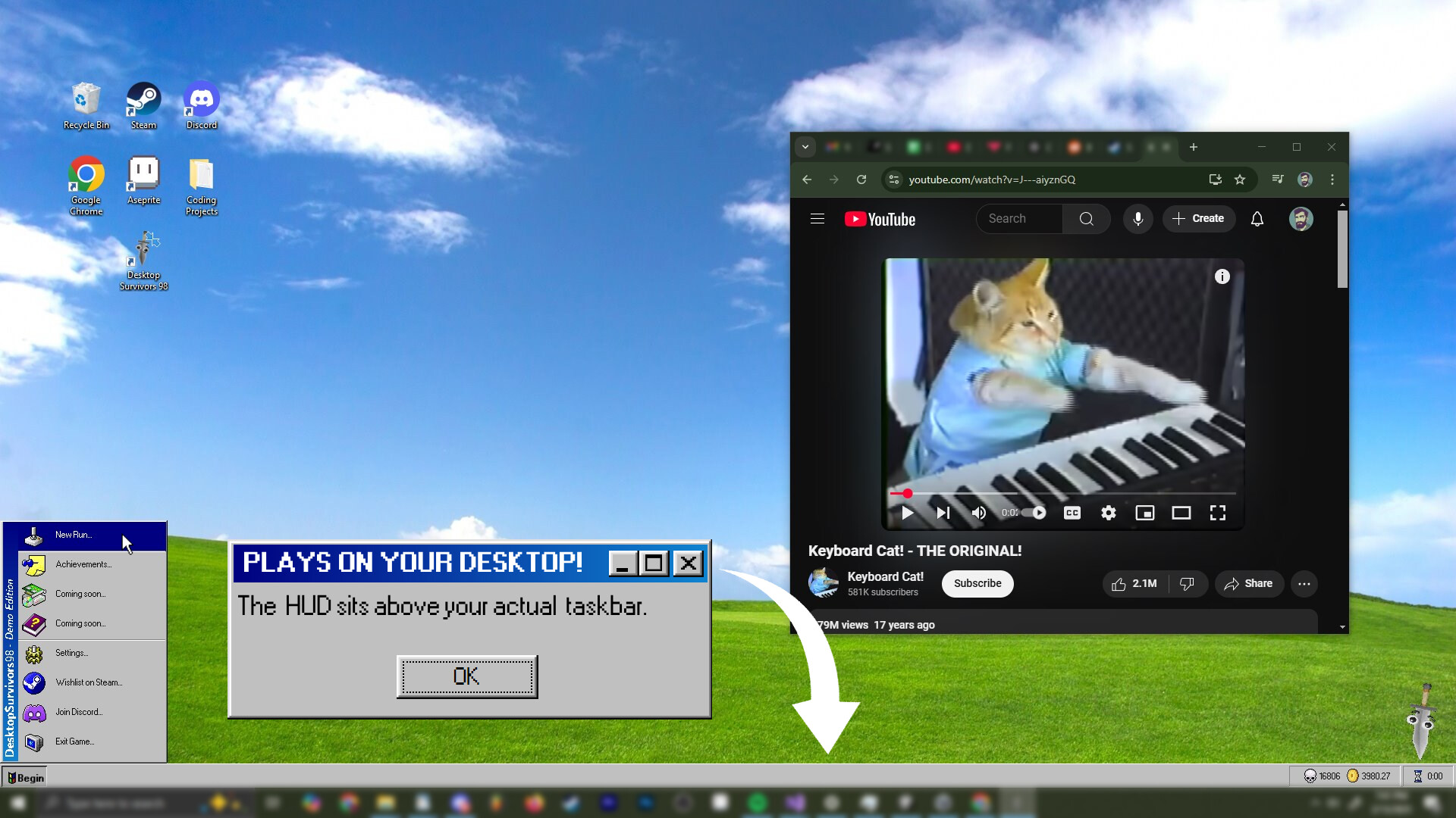 Desktop Survivors 98 doesn’t play in a window — it plays over your desktop. Enemies, upgrades, and chaos unfold across your real screen.