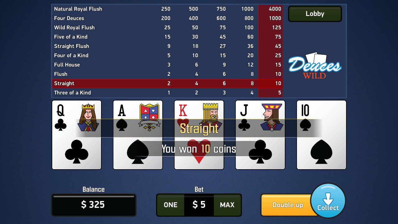All the basic rules of poker are adhered here and the maximum win is 4000 coins for Natural Royal Flush (No wild cards).
