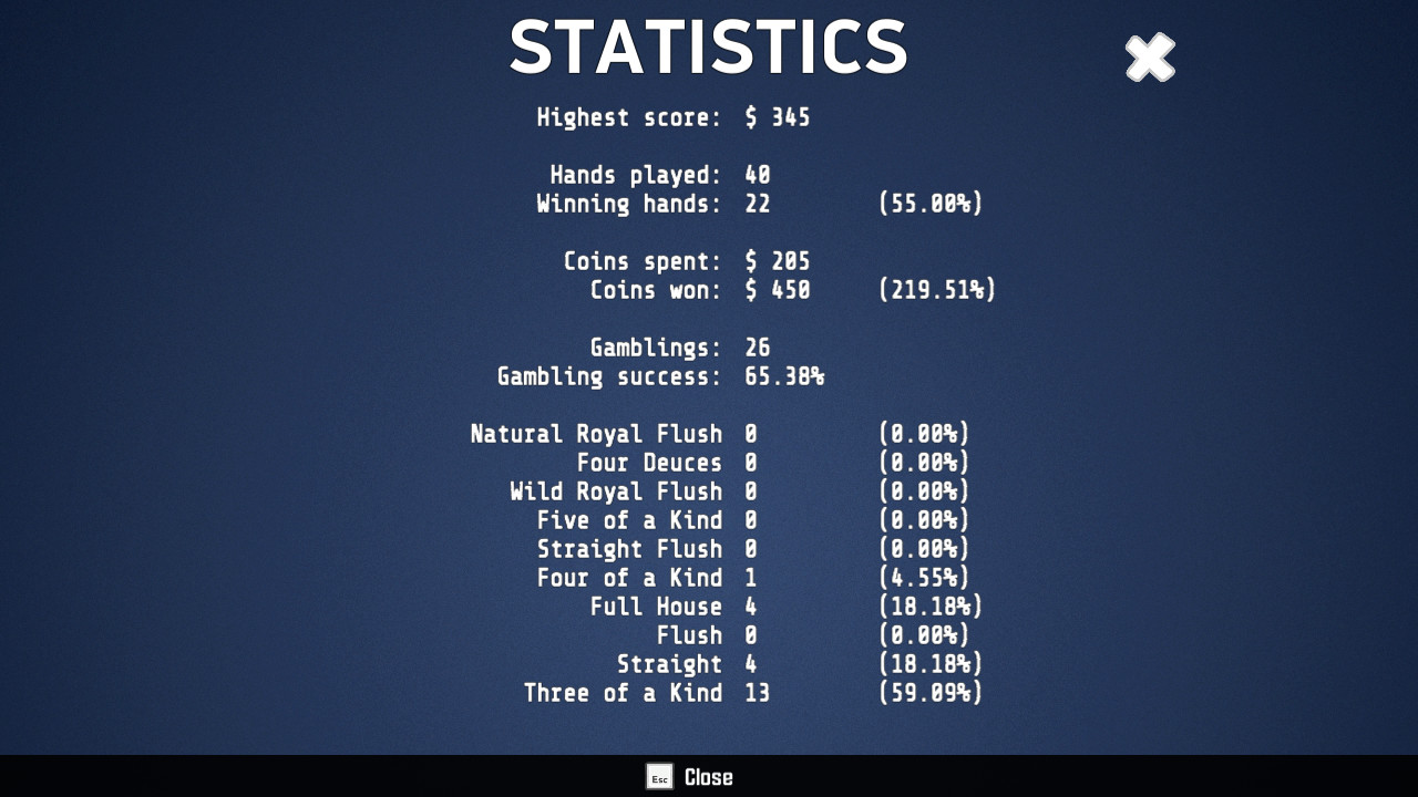 The aim of the game is to build the best possible poker hand. The game is won if the player's hand contains at least a Three of a kind. At first you are dealt five cards, you then choose which to hold on to before discarding and replacing the others. You are then paid depending on the strength of your hand.