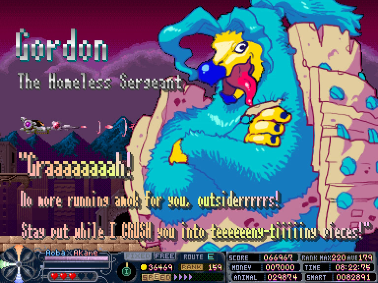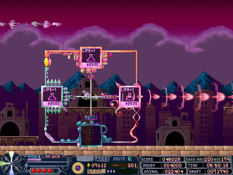 The player controls Akane and Aoba, Momoko’s schoolmates who were hired to help start construction of the towering subterranean bridge until they discovered the extent of her plans. They decided to thwart the ambitions of Momoko and her loyal beasts with their work ship, the Speleological Fighter Pink Aurora.