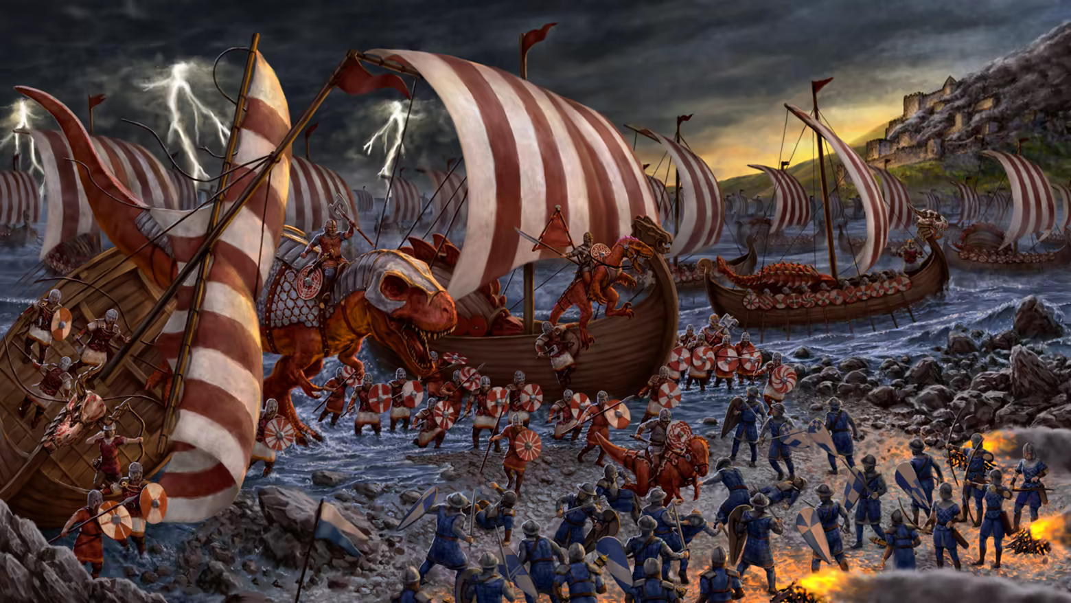 In 1002 The King of Denmark, Sweyn Forkbeard, launches the first dinosaur-powered conflict with his invasion of England, shocking the defenders and forever altering the course of history.