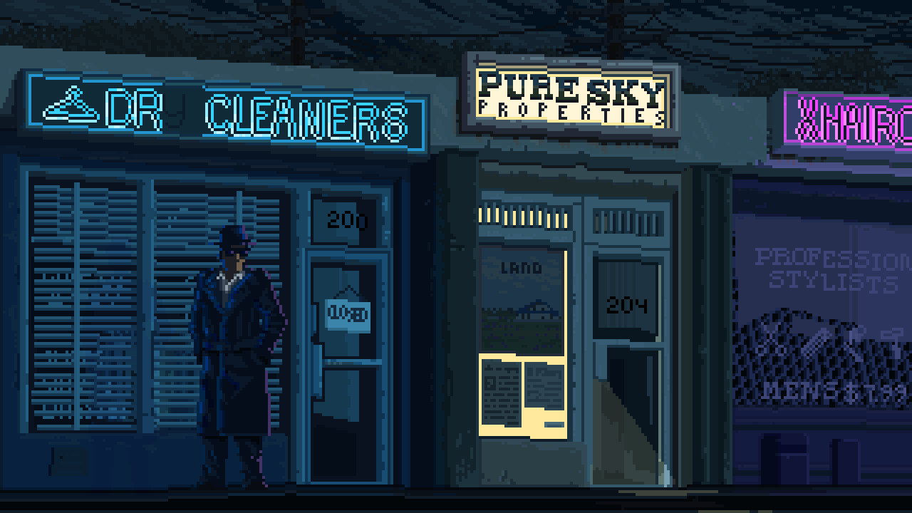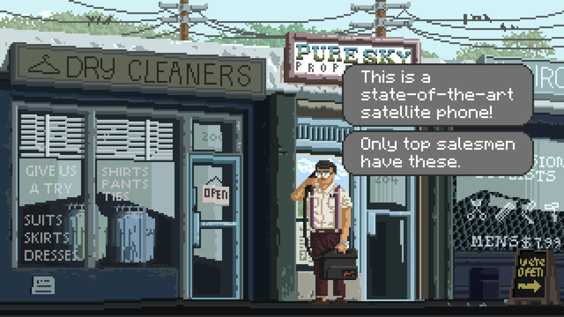 Welcome to your new job. At the start of every day, you begin out front of an unassuming, drab strip mall, where Pure Sky Properties is tucked away. Every day brings new characters to meet, new events to experience, and new stories to be told. What will it be tomorrow?