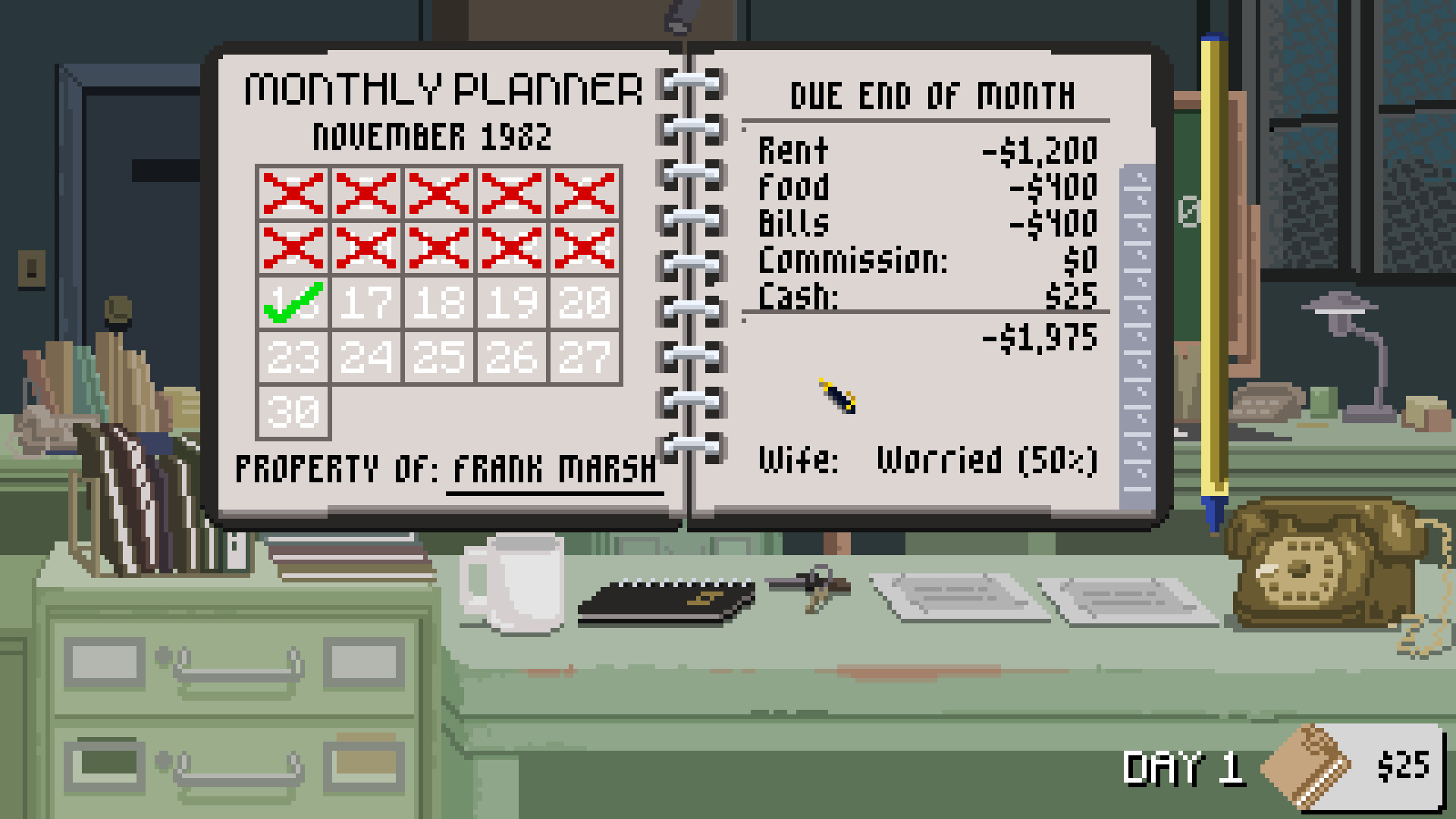 Dirty Land is a game about real estate, crime, and desperation, inspired by classic sales movies of the 80s and 90s.