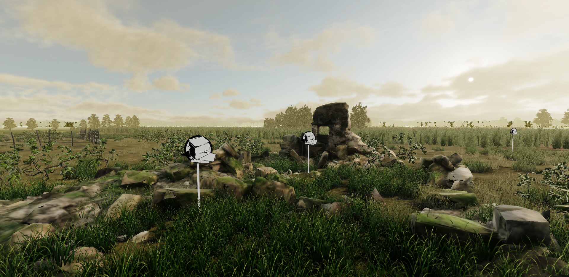 Based on the history of a real Texas town, Discover Old D’Hanis features ruins, historically-informed landscape and sound design, interactive features, artistic reconstructions, and an original musical composition based on old German folk songs. It provides a glimpse into a real archaeology project and demonstrates how we come to understand the past through its fragments.