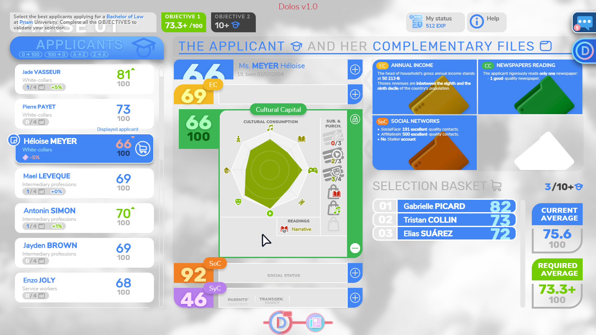A sci-fi political thriller. Live the life of an operator of DOLOS, a social regulation system predicting everyone's future. Analyze applicants' profiles and decide about their lifetime career. Apply DOLOS' logic or find how to counter it ... but don't get fired!