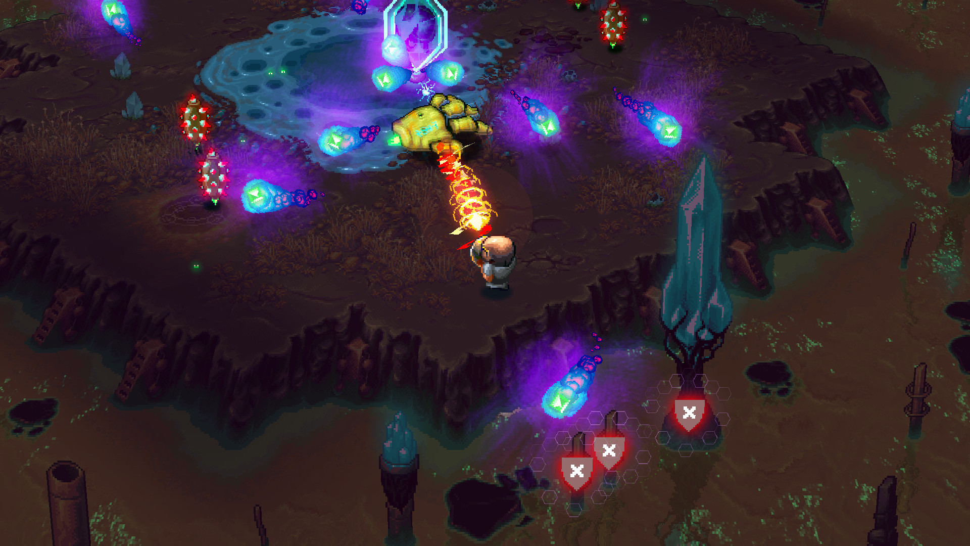 Procedural generation, lots and lots of upgradeable weapons, spells, perks, alien artefacts, strange technological and magical devices, enemies, NPCs, traps, custom events and hidden shops. So many of those, you'll feel overpowered. On the surface it is a beautiful isometric twin-stick shooter, but inside there's a huge emphasis on depth, variety, replayability and discovering all those amazing synergies that make your eyes pop!