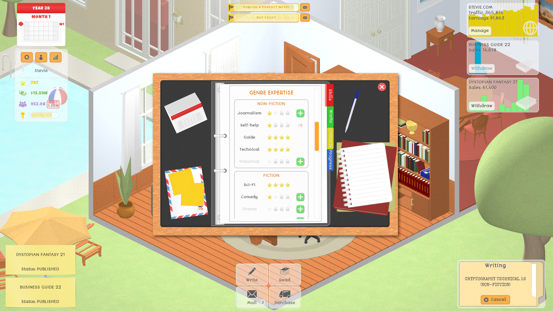 As you gain experience, you unlock new work types, genres, topics and purchasable items which provide you with perks, allowing you to improve your works and progress in the game.