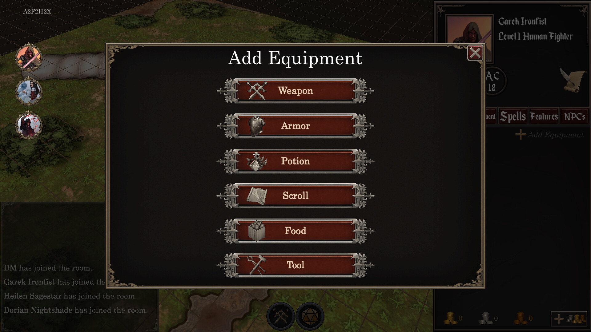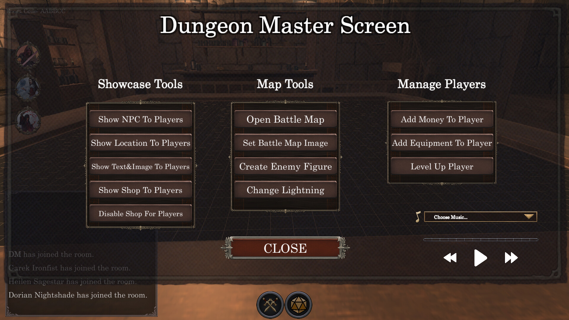 Dragon Inn also helps Game Masters with its control panel. In this panel, you can show images, display text, manage NPCs, reveal locations, add equipments to players, set player status effects, and more! It includes its own battle map and token system, so you don't need to worry about setting up the battlefield.