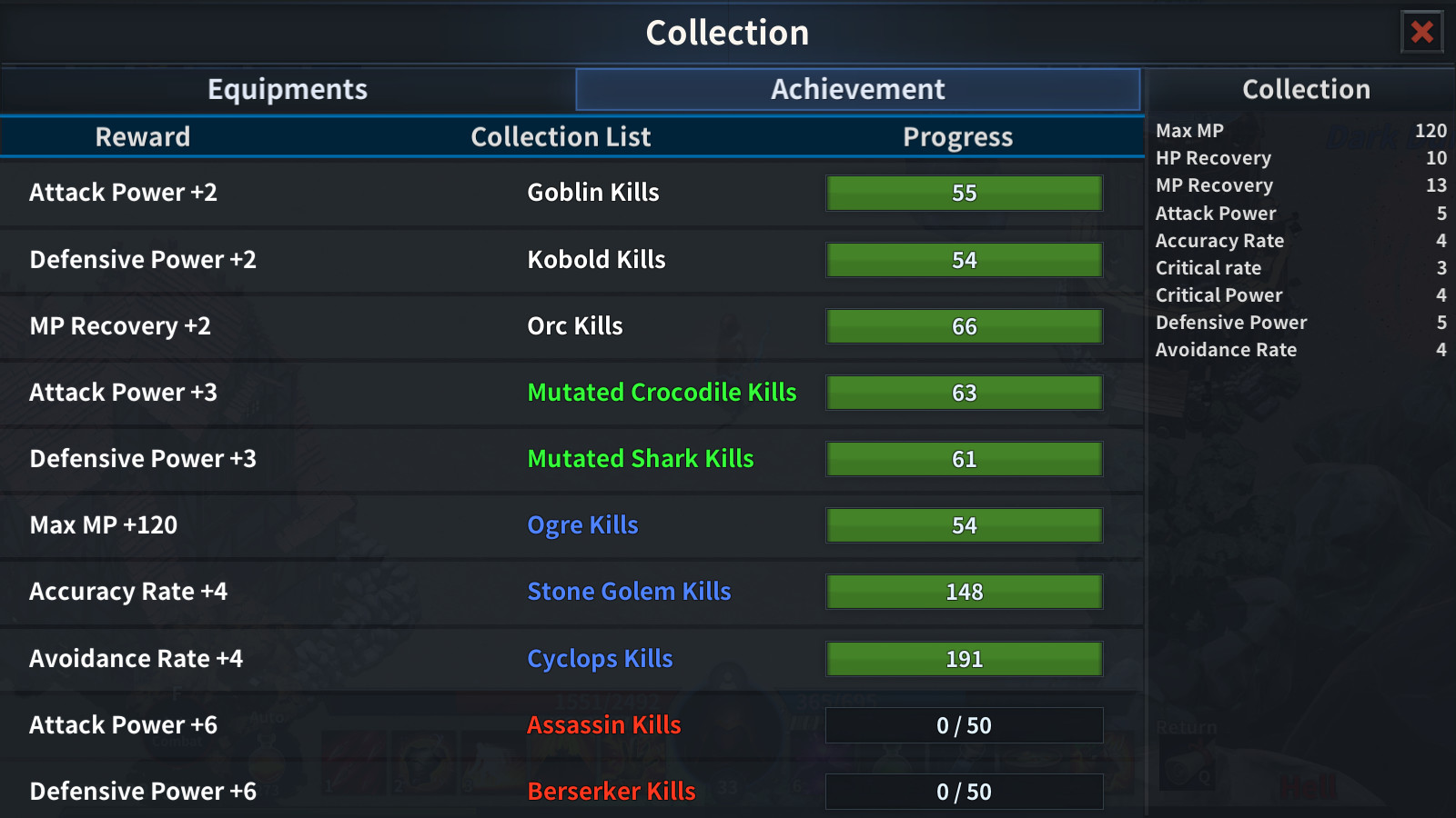 [Collection] 1.Item : You obtain a variety of stats if you register the remaining items. 2.Achievement : You obtain a variety of stats if you kill certain monsters.