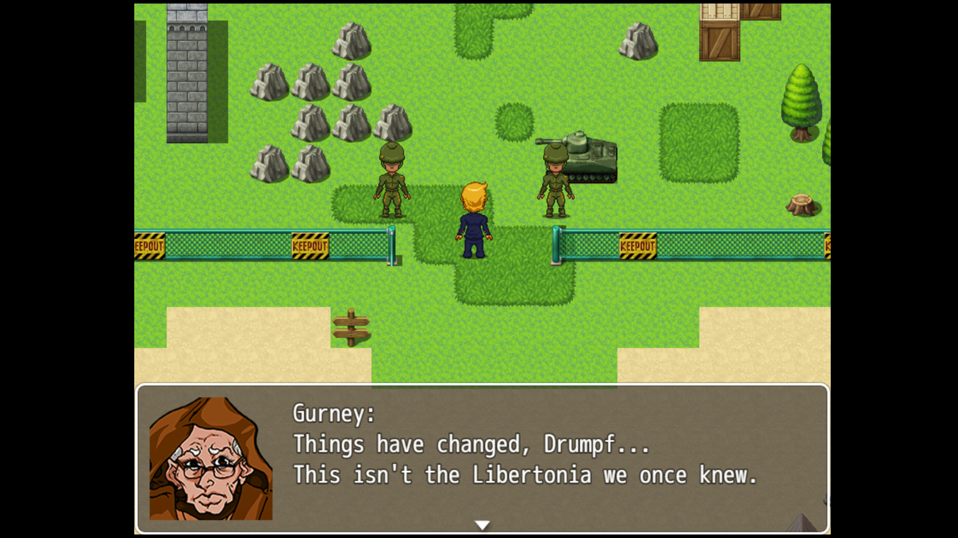 In Drumpf: Rise Up, Libertonia!, you take the mantle of Drumpf; once God-Emperor of the super-continent of Amerika, yet now downtrodden and deposed by his former compatriots. Once revered as a bastion of freedom and democracy, the super-continent of Amerika has been corrupted by the Usurpers; dictators who helped overthrow the rightful rulers of the world.