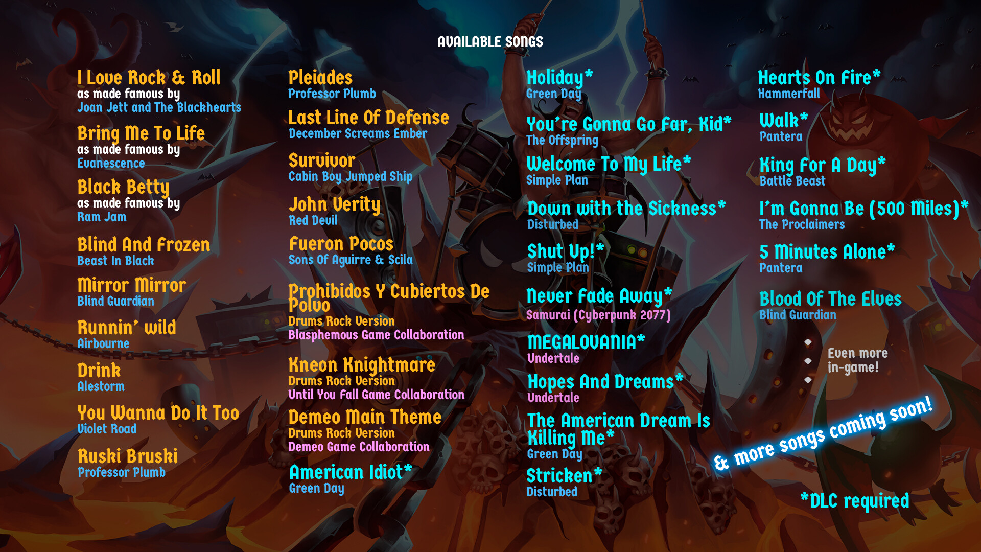 Features: Custom songs and Workshop support! Unleash your creativity and take your gameplay to a whole new level. Discover optional paid DLC tracks feat. Green Day , The Offspring , Undertale , Simple Plan , HammerFall and more! Real Rock! Hard rock, heavy metal, Nu metal, among others. A wide variety of rock, with original music or hit groups! Stylish and crazy graphics, with a brutal finishing level TRUE Drums Set! A drums set that you will have to play and you can customize! More than 5h of only CAMPAIGN! Plus all the extras! Dozens of unlockables! Drumsticks, drums, songs... Intuitive gameplay for everyone. No dizziness. Play in a chair. Feel the rock n roll with advanced levels, make flourishes with the sticks and master the drums. PHASE enemies and boss, special levels and different worlds to discover. Online Ranking! Compete against your friends and beat their scores. Musical versions of other videogames!! Watch out! 4 levels of difficulty! For all levels and with a fair progression! More than 68 songs and new songs are incoming! With classic songs like "I Love Rock 'N Roll" and "Drink" by ALESTORM and more! Spectacular boss battles!