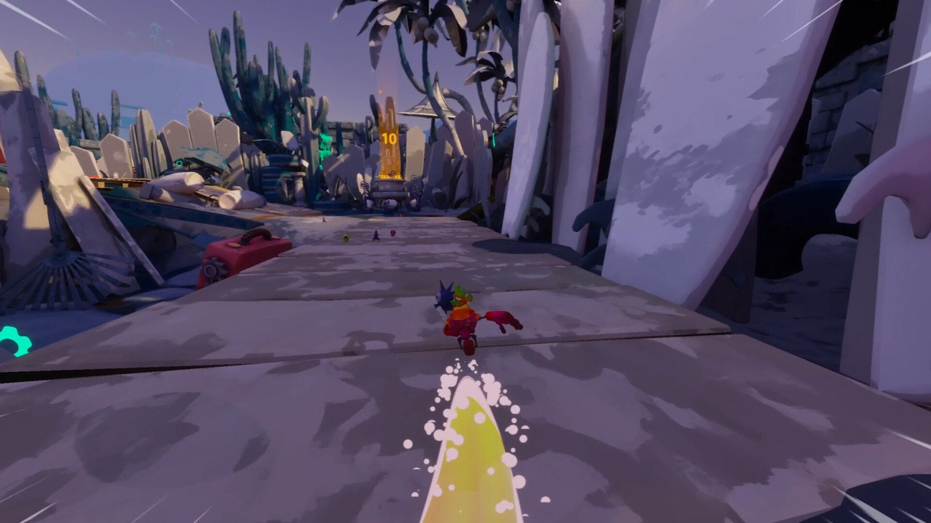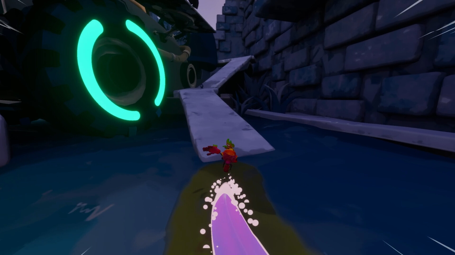 Well, the development team couldn't figure out if the player is: slurp & sliding, dash & riding, zip & zapping, jump & pumping, boot & scooting, hop & bopping, surf & turfing, smooch & smacking, blink & skipping, boom & zooming, Plink & Plonk™-ing, but in any case you go very fast, so how about you just go and figure out and tell us later in the reviews.