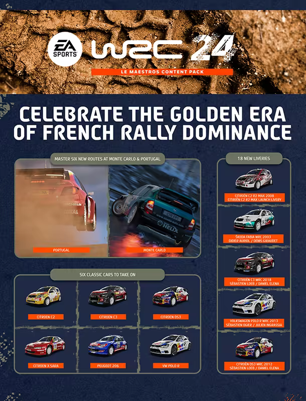 Buy the EA SPORTS™ WRC 24 Le Maestros Content Pack and Dive into a golden era of rally racing with the Le Maestros Pack, a tribute to the iconic French dominance from the late 1990s to the 2010s. With 6 stages being added to Monte Carlo & Portugal, seven classic cars to master & iconic liveries.