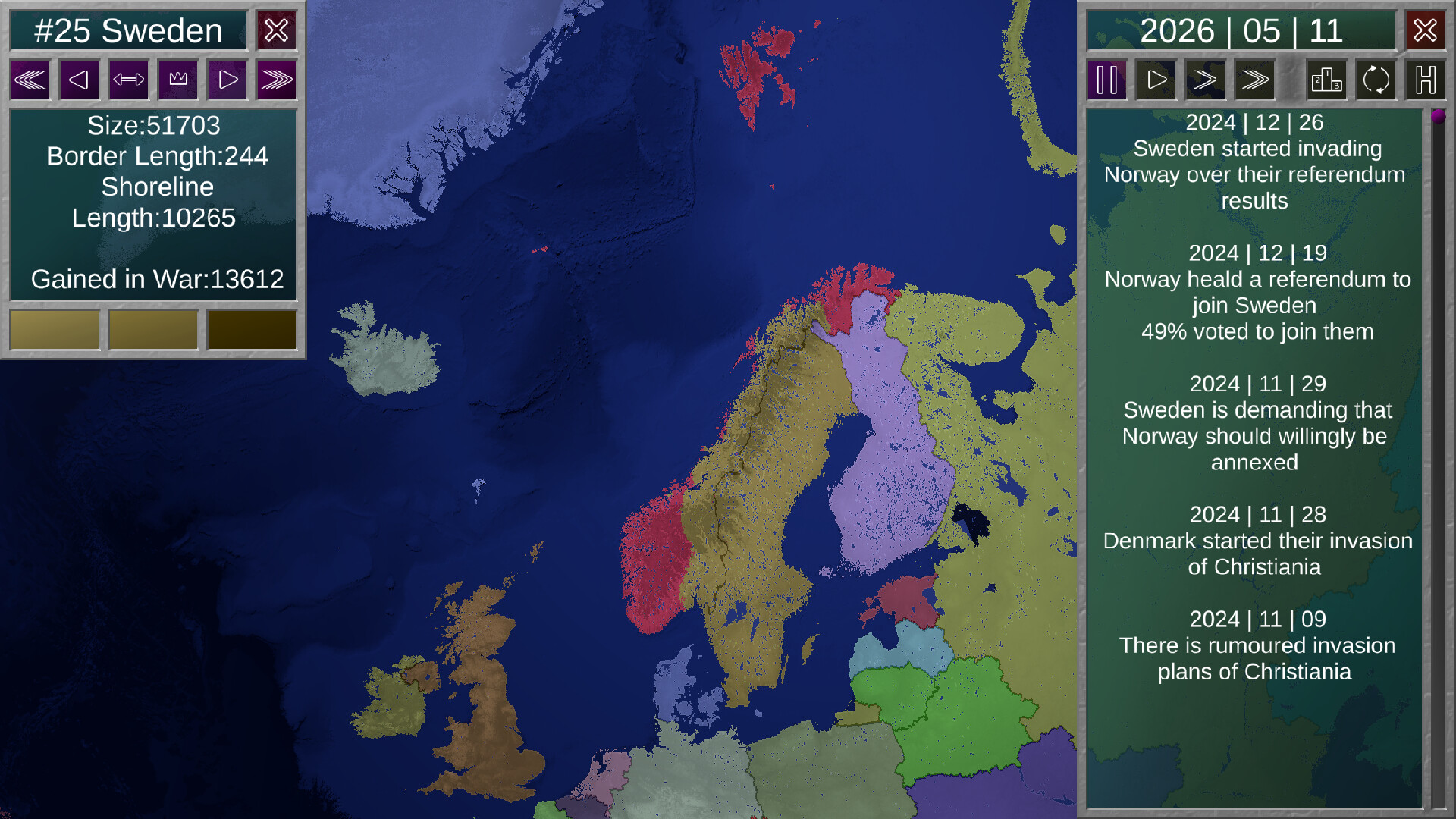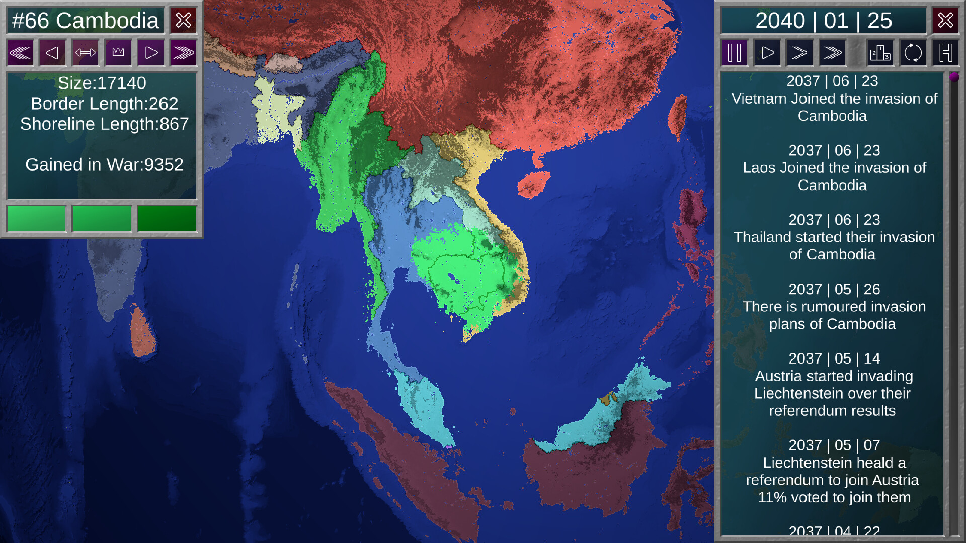 EarthRoyale 3 is a simulation map observation game where the aim of the game is to watch as the world turns into chaos in front of your eyes, watch as empires fall, new empires rising, independence movements either failing or succeeding, new land being formed, continents being flooded and turned into oceans truly anything can happen.