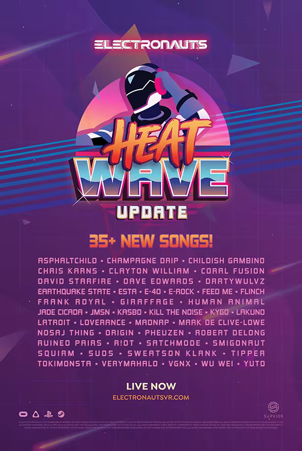 Electronauts is powered by Survios’s proprietary Music Reality Engine™, which transforms song elements into interactive components that will always sound epic no matter how you mix them. Throw sonic grenades, drum on synth orbs, and rearrange vocal hooks as you dream up your unique arrangements.