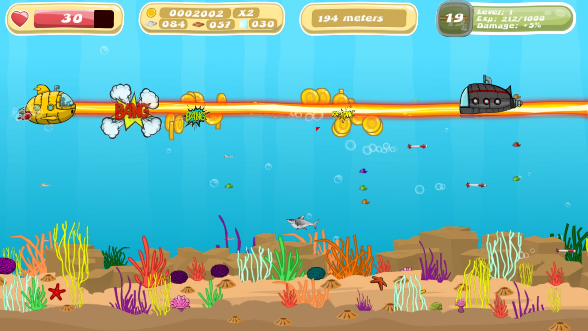 Endless Treasure Hunt is a colorful endless runner, your job is to collect as many coins and materials as possible to buy new submarines, warships and helicopters to increase the maximum distance traveled.