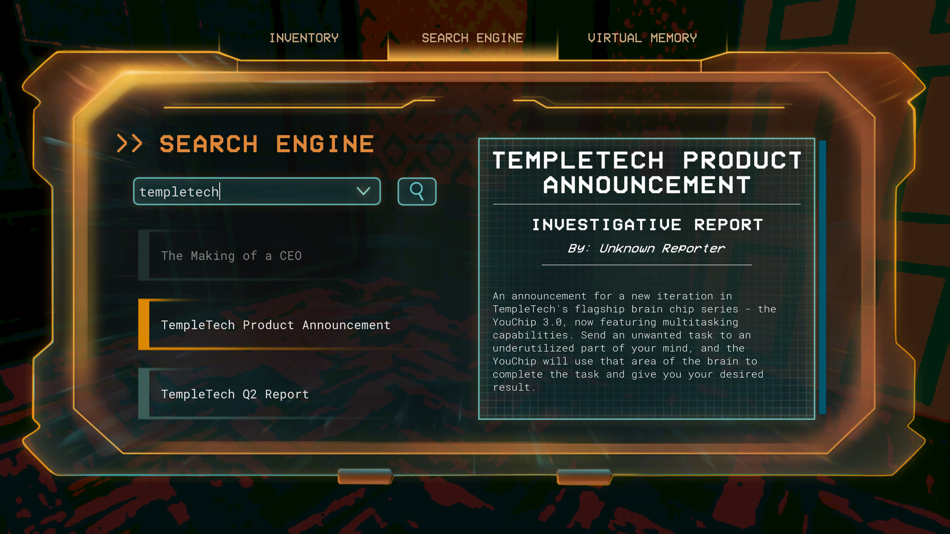 As you unveil the company's dark secrets, experience the thrill of piecing together an intricate mystery in a futuristic world brought to life in a captivating 90s retro aesthetic.