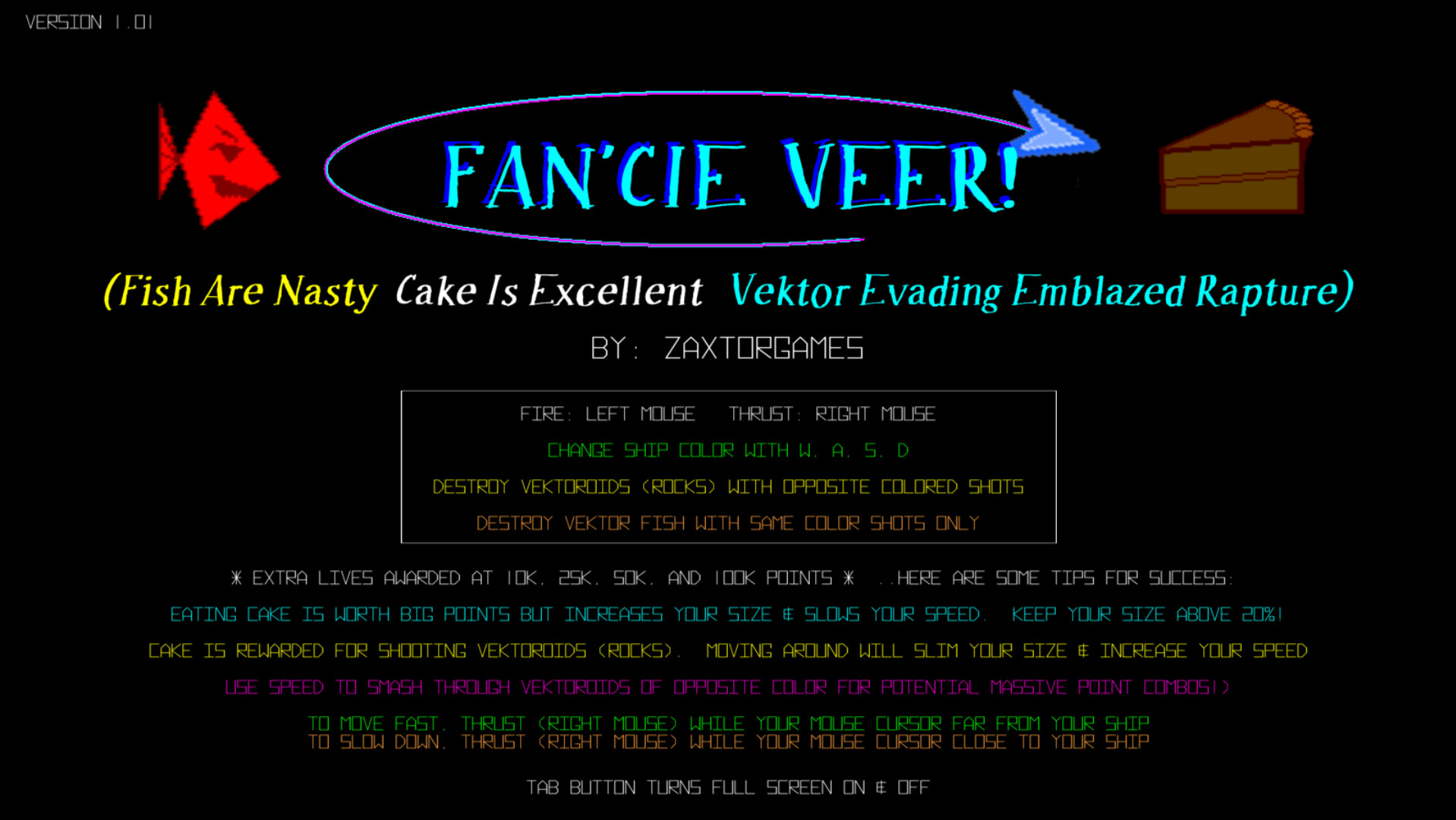 Frantic action awaits you in this game all about surviving and collecting as many points and cake as you can! "FAN'CIE VEER" is a unique new high octane retro action game that will have you eating fattening cake, moving to slim down and veering to avoid all of the rocks and deadly fish!