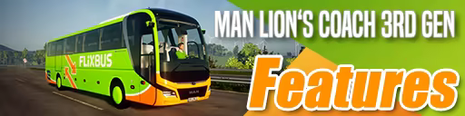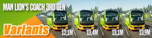 This DLC package expands your fleet with the MAN Lion's Coach 3rd Gen in all four variants: Lion's Coach, Lion's Coach C (two-axle), Lion's Coach C (three-axle) and Lion's Coach L.