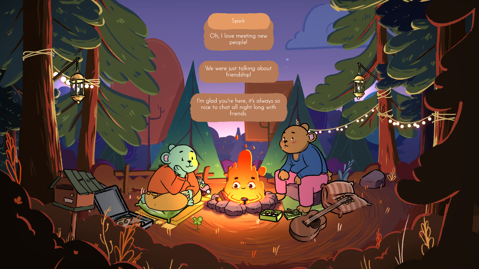 The "Summer Camp Demo" of Campfire, a game about sharing emotions and listening to the ones of other people. Embody a cute character, create your cosiest safe place and gather around the campfire to be a part of a collective story. We all need a good talk under the stars