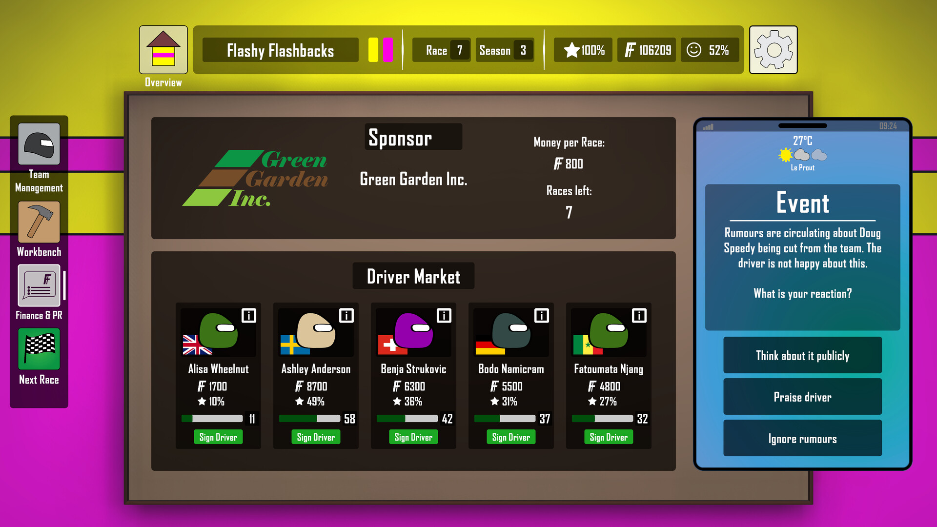 Manage your team to motorsport glory and leave your opposition behind. Flat Spot is a casual motorsport management game that let's you experience fast-paced races, fun encounters off-track and the excitement of owning a team and helping it win the world championship.