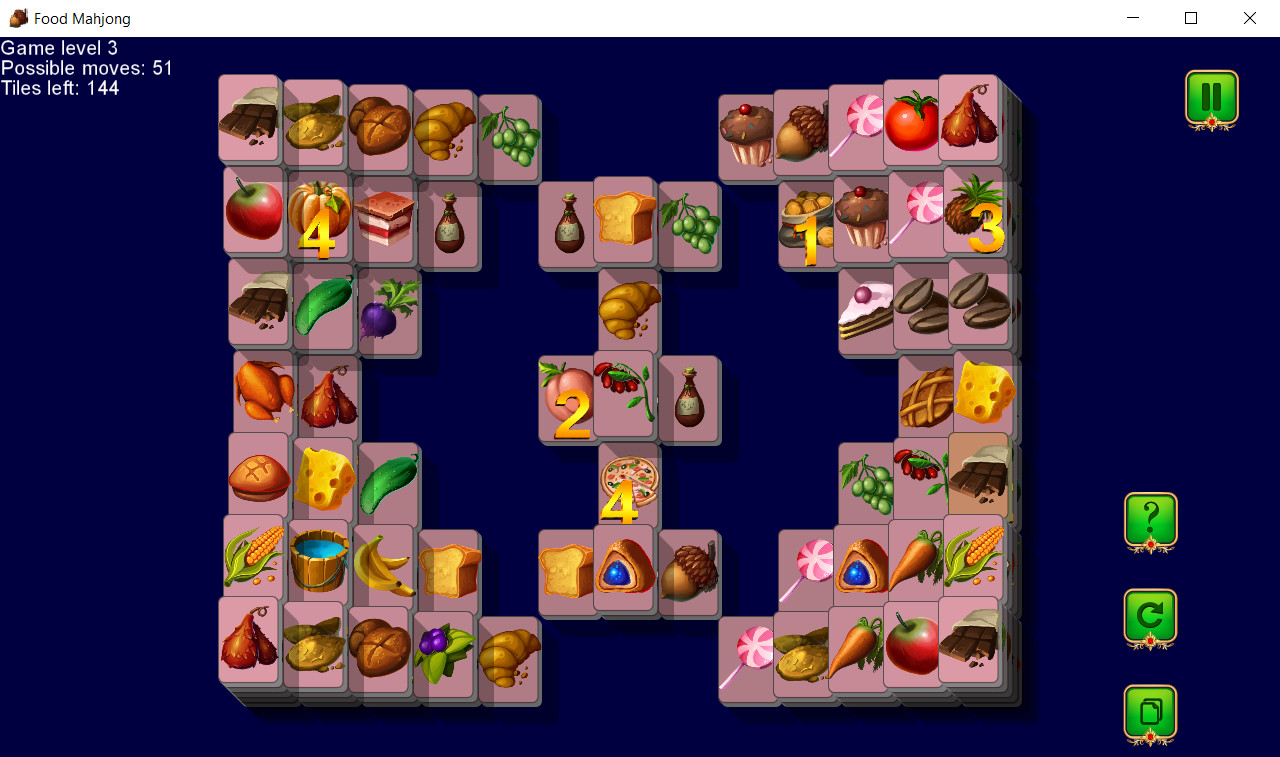 Food Mahjong is the perfect game for the casual player looking for fun and extensive gameplay. The goal of this game is to match open pairs of identical tiles and remove them from the board. The game is finished when all pairs of tiles have been removed from the board.