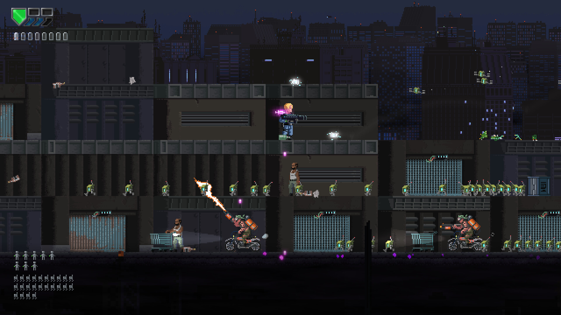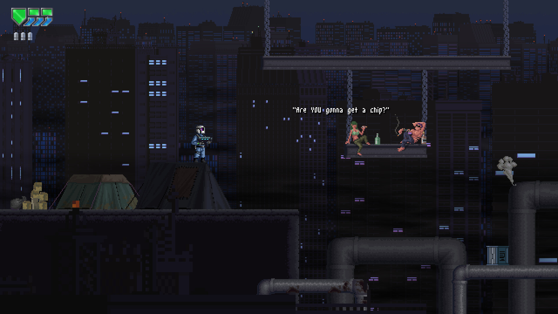 Forehead Chip is a cyberpunk pixel-art platformer set in the middle of Arca City, a fracturing utopia. You’ve joined the Implant Corps to restore order by capturing vile Holdouts. Capture the most and you win!