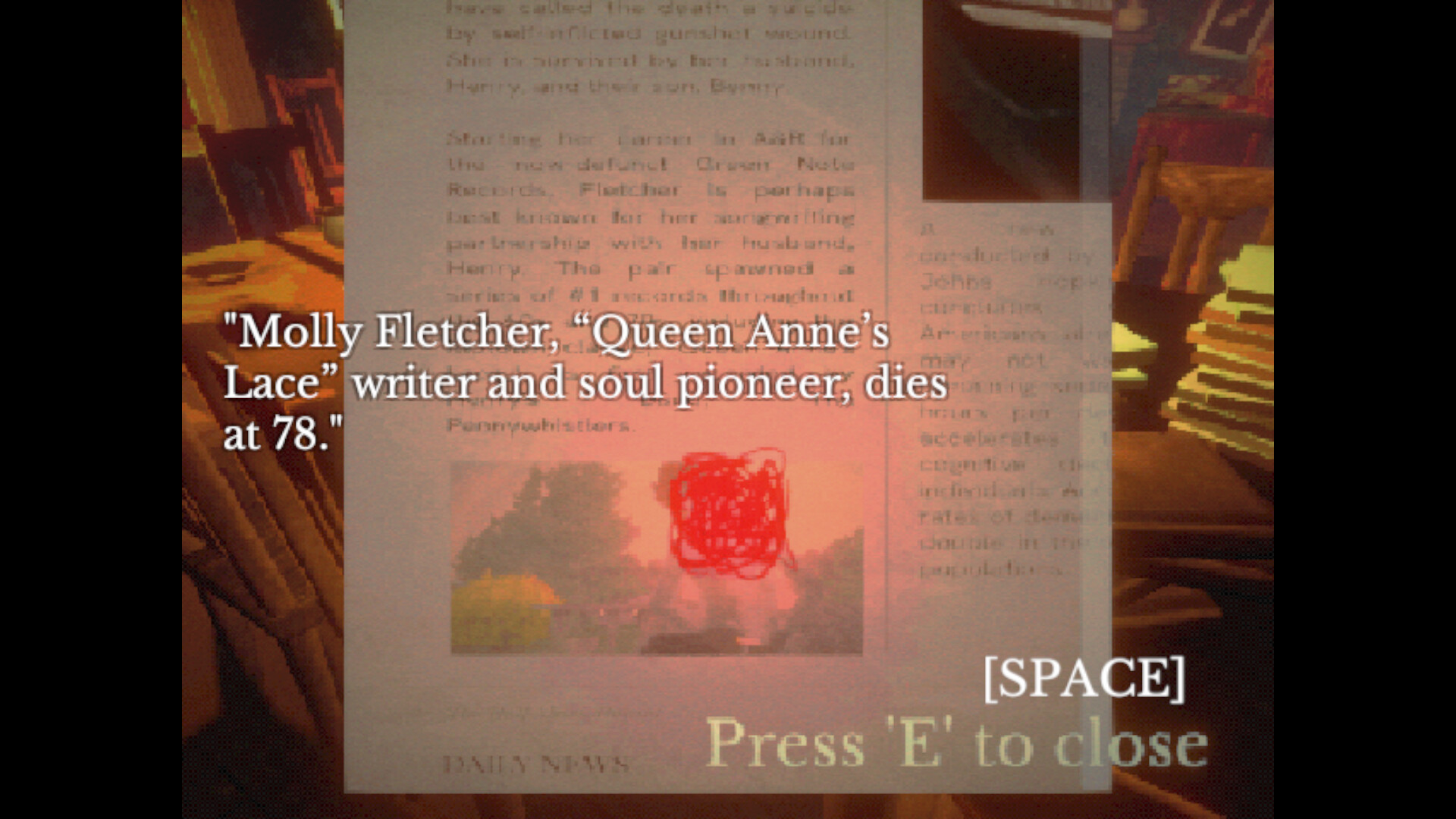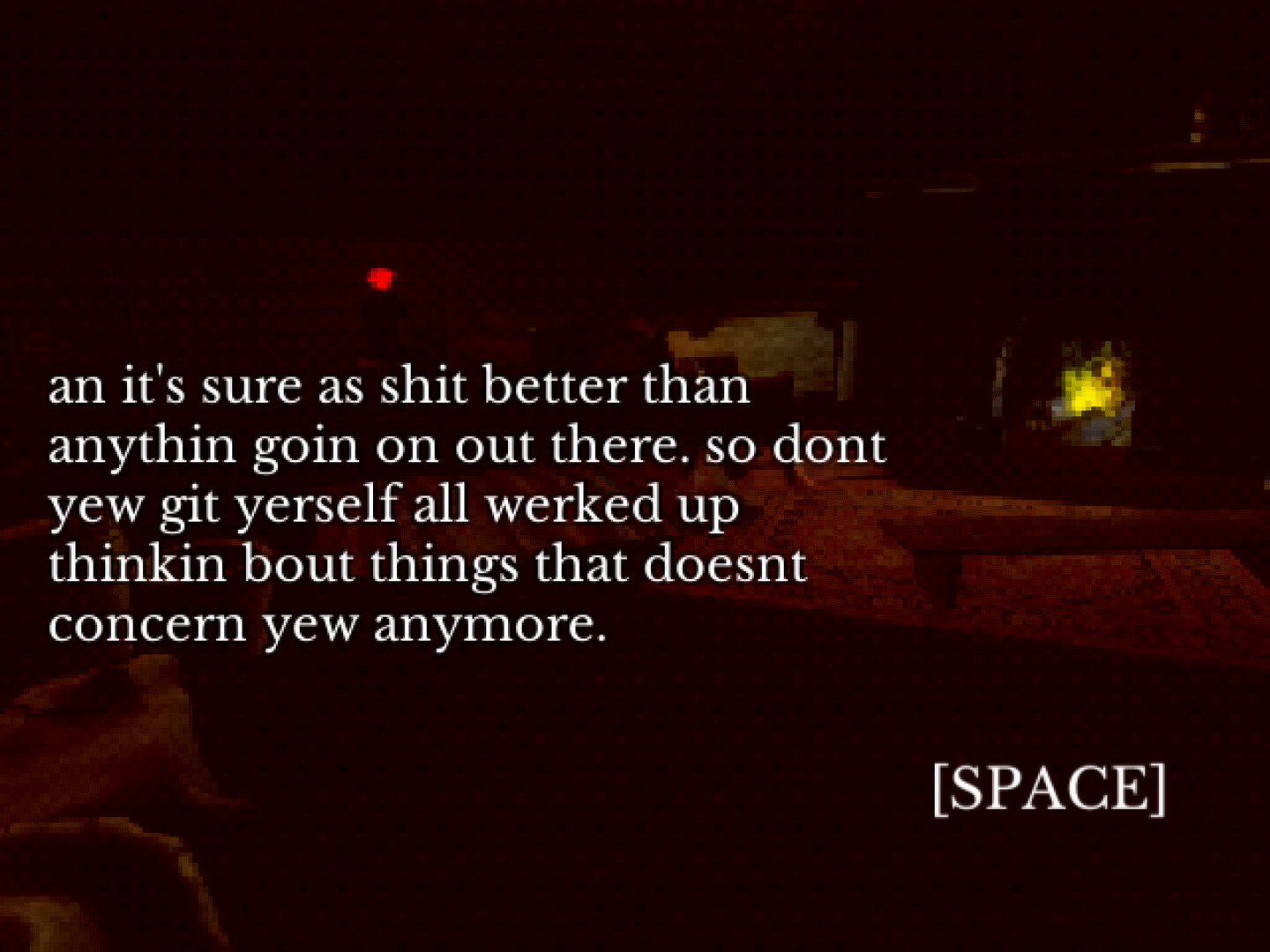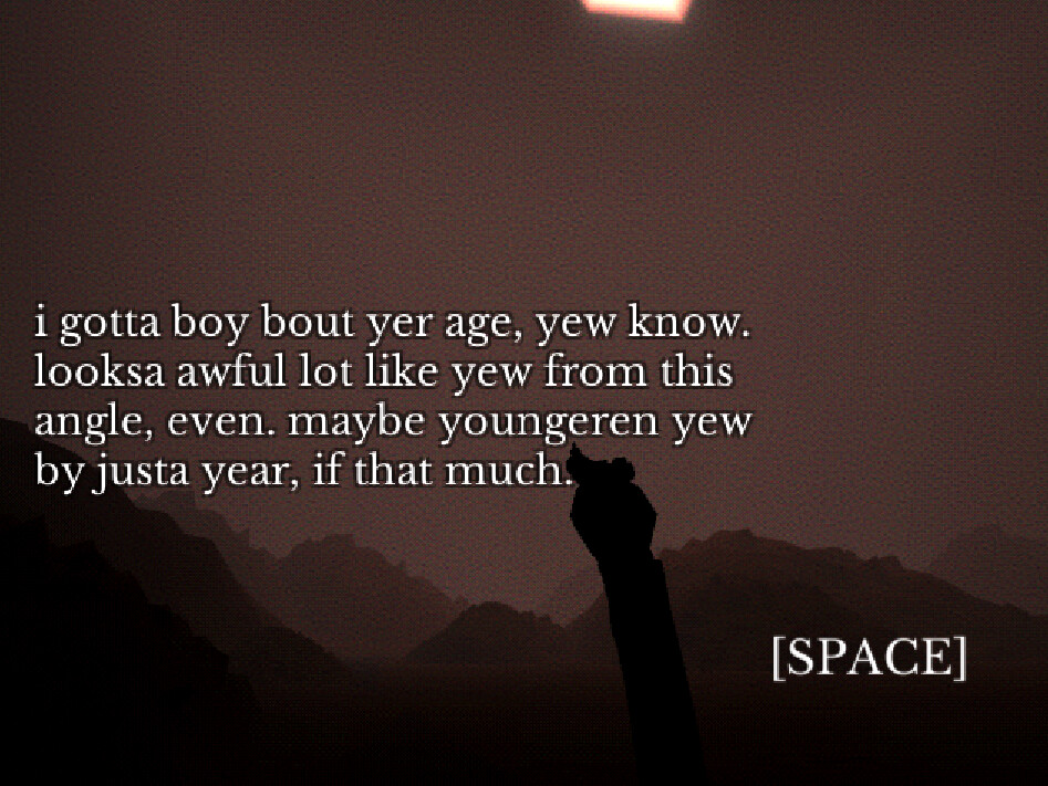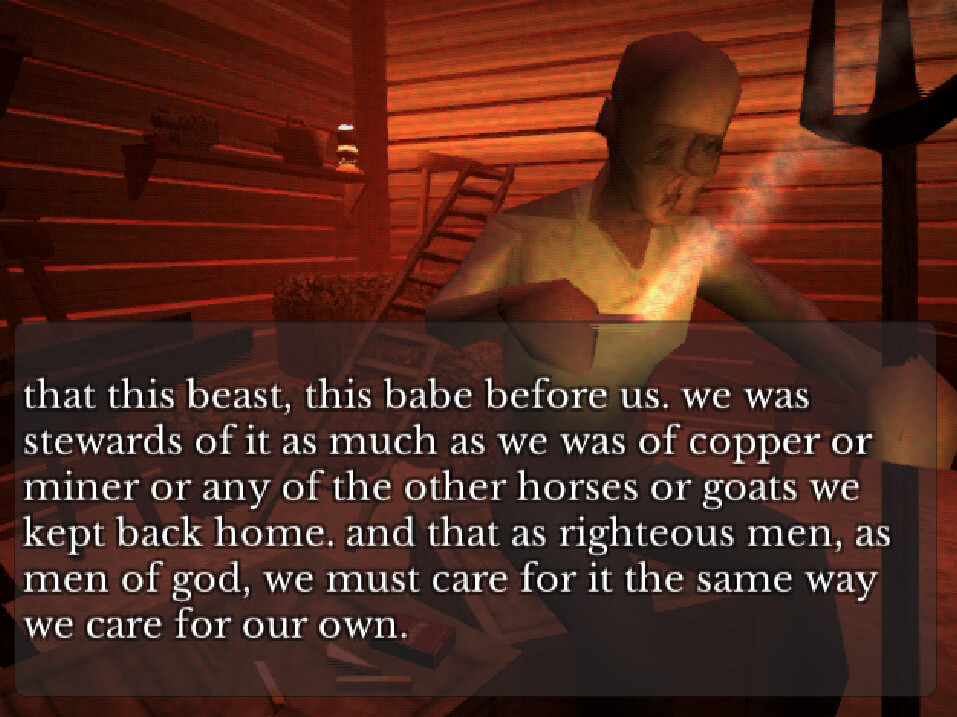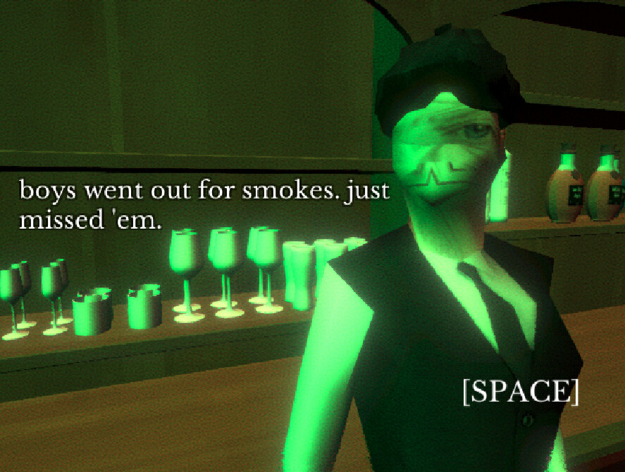 Heavily stylized dialogue offering clues to piecing together the mysteries of the experience as memories spill into the present day