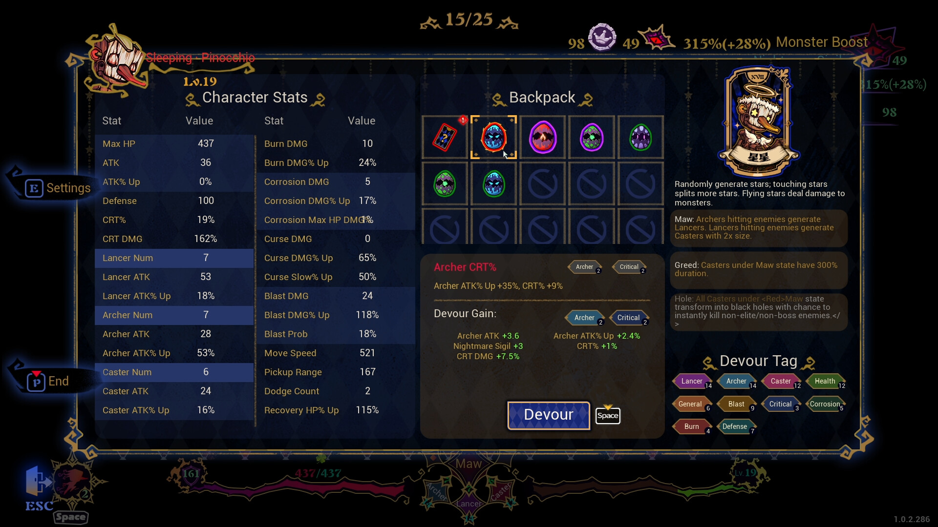 Pinocchio wields 3 weapon types, which combine into 6 unique attack styles based on their order. Each style offers 3 exclusive talents—18 in total—that synergize with powerful Tarot abilities. Mix and match with 100+ items to create your own custom build!