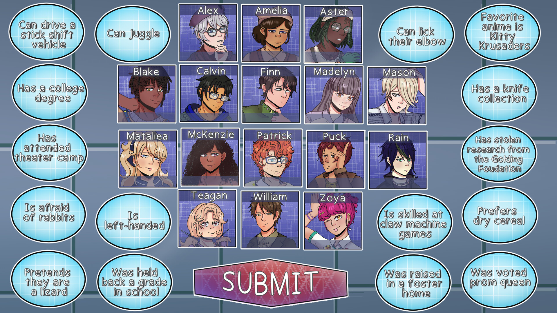 Friendly Facade is a visual novel with point and click and strategy mini-games incorporated into key story moments to immerse the player in the experience. The game explores how each character's background and strongly held ideals inform their personality, decision-making, and strategy in tense situations. Every character has their own goals and motivations and form a web of interpersonal relationships that intersect and collide with each other to form a rich, nuanced story where not everyone is able to get a happy ending. Inside the peaceful confines of the Isolated Society Study, competition, manipulation, and betrayal run rampant, and this is before the Golding Foundation intervenes, changing the rules of the game, and the fates of those 16 individuals trapped within it, forever...