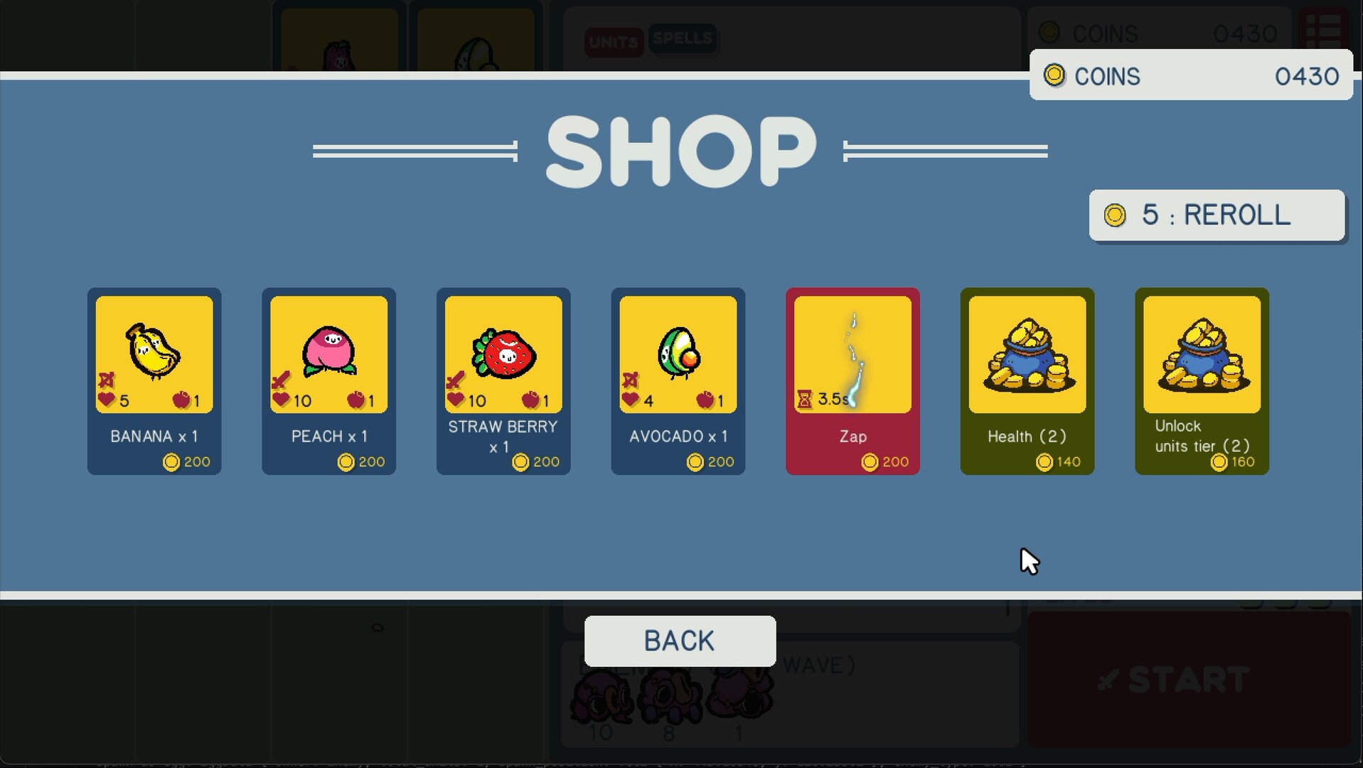 At the start of each round, you’ll spend coins to grab fruit or spell cards. Fruit cards summon little fruit warriors into battle. Spell cards let you zap stuff or boost your team mid-fight. Simple enough.