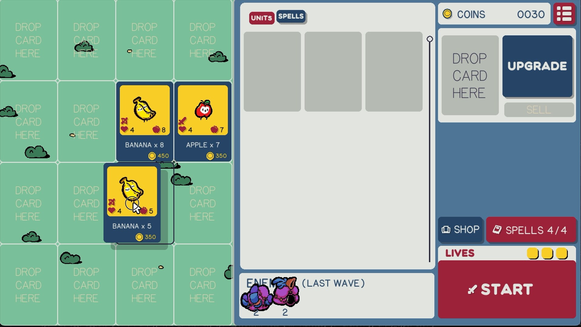 If you’ve got a fruit card you like, you can spend some coins. That just means it’ll summon more units. (Sadly, spells don’t upgrade—but they’re strong already.)