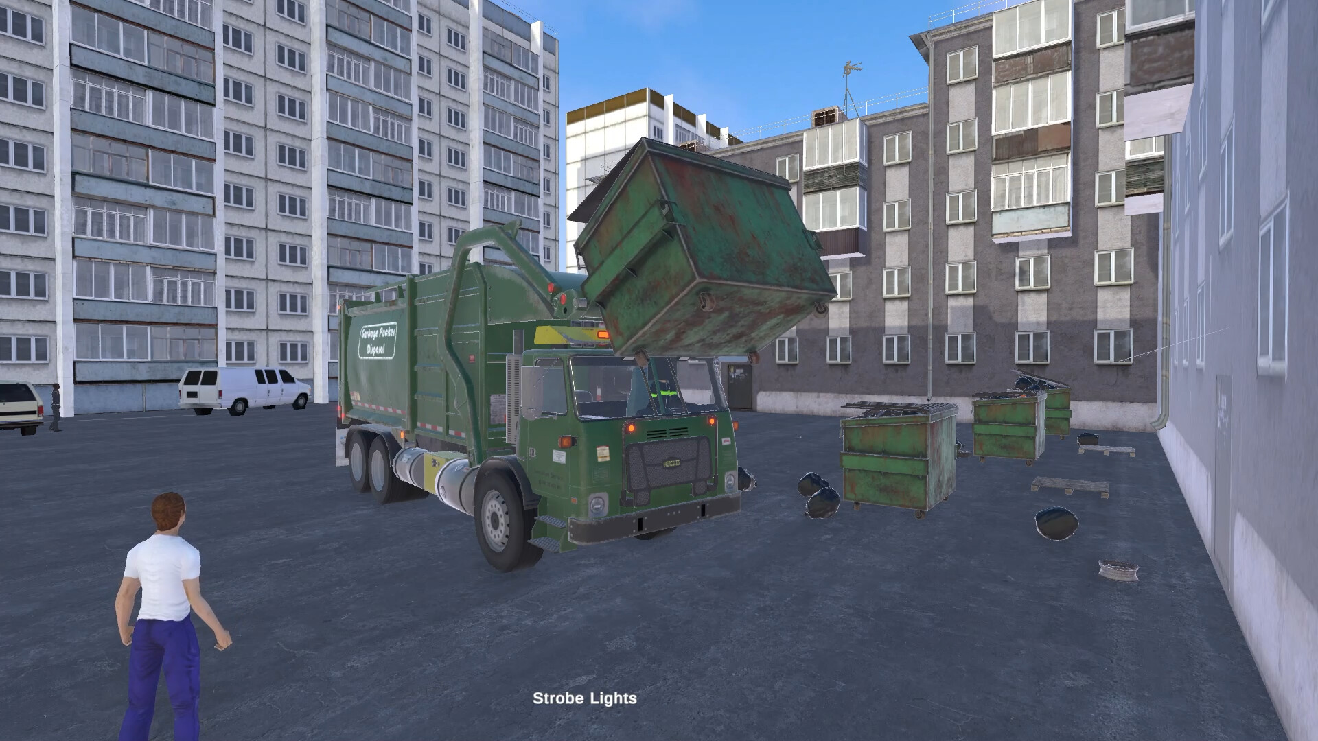 Physics-Based Trash Collection – Use realistic truck controls to lift dumpsters, dump trash, and crush it with the packer to maximize space.