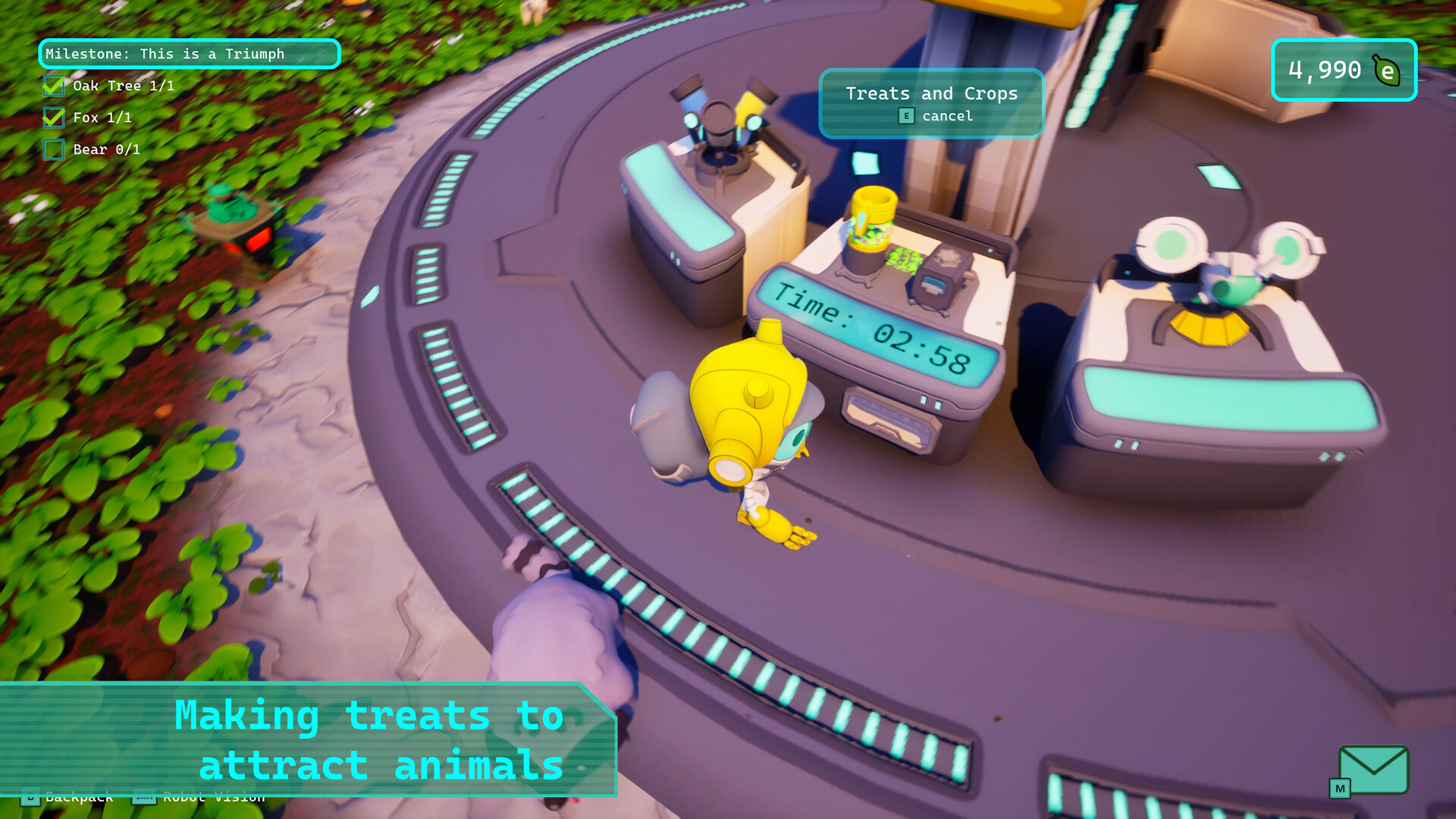 Along your journey, you unlock a few crops to plant and harvest, a few recipes for new treats to make at the treat console, and new decorations to both beautify your garden and further entice more animals to stay. You'll also unlock and be rewarded with cosmetic items to transform your robot, consoles, and more.