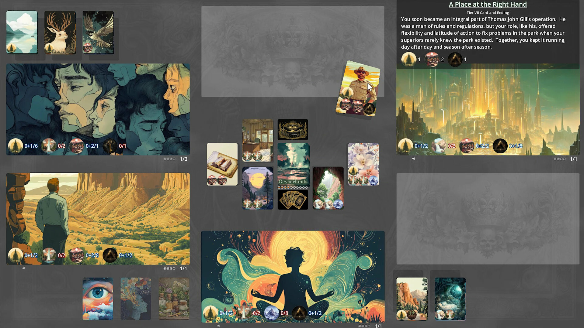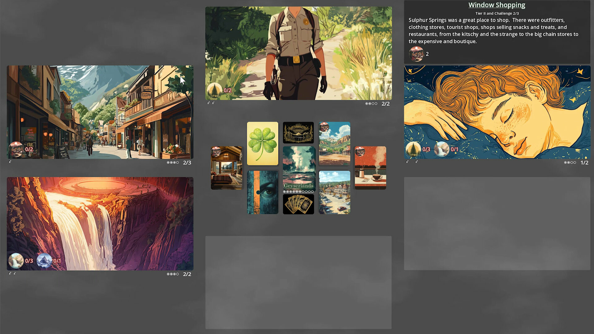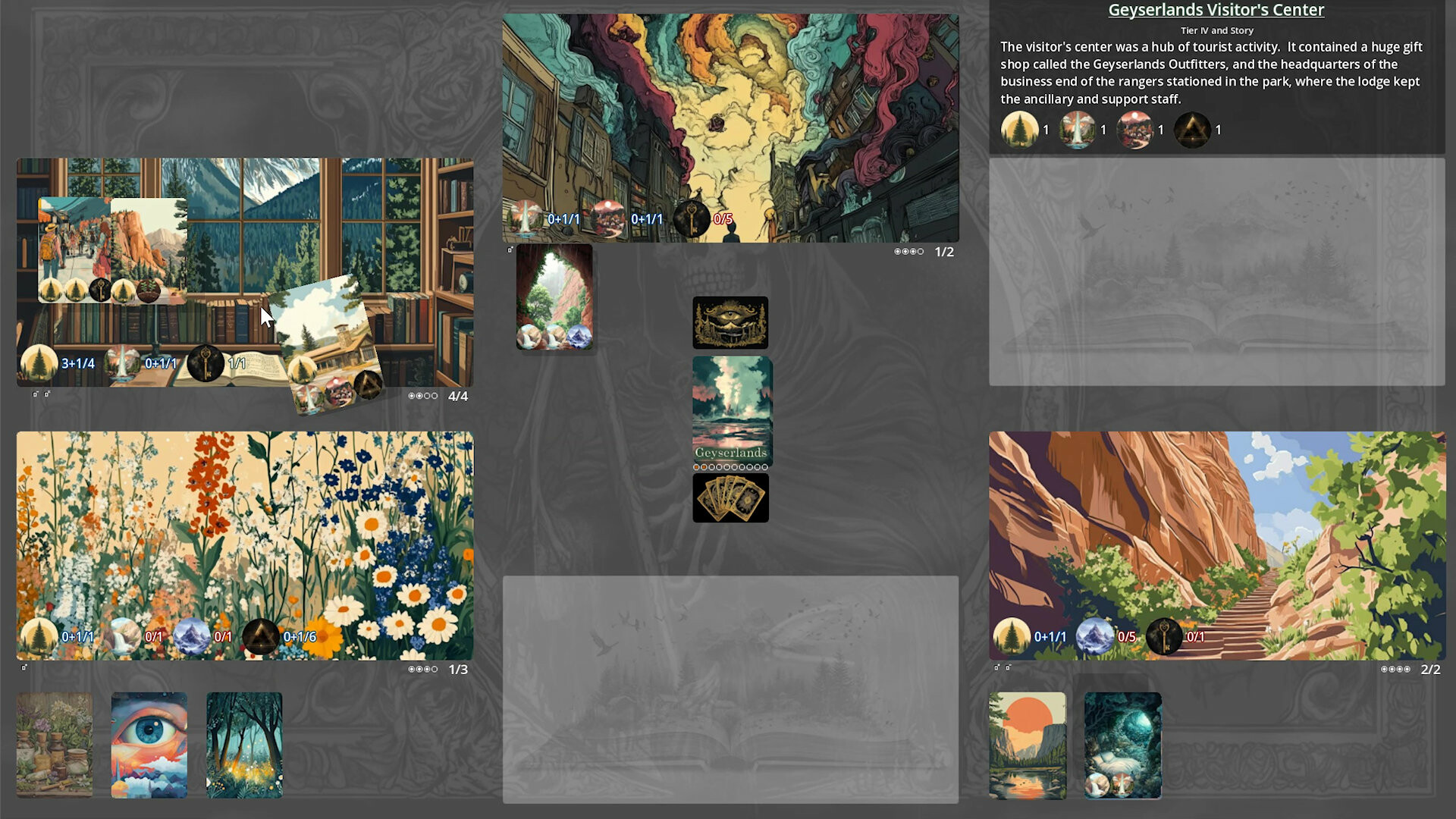 Geyserlands is a deck-building game of modern otherworldly mystery. You are a detective just assigned to a national park nobody knows exists. Gain new cards and upgrade your deck as you explore the mystery of Geyserlands. Unlock secret powers and gain special advantages. But delve too deep and Geyserlands will consume you. How will your story end in Geyserlands?
