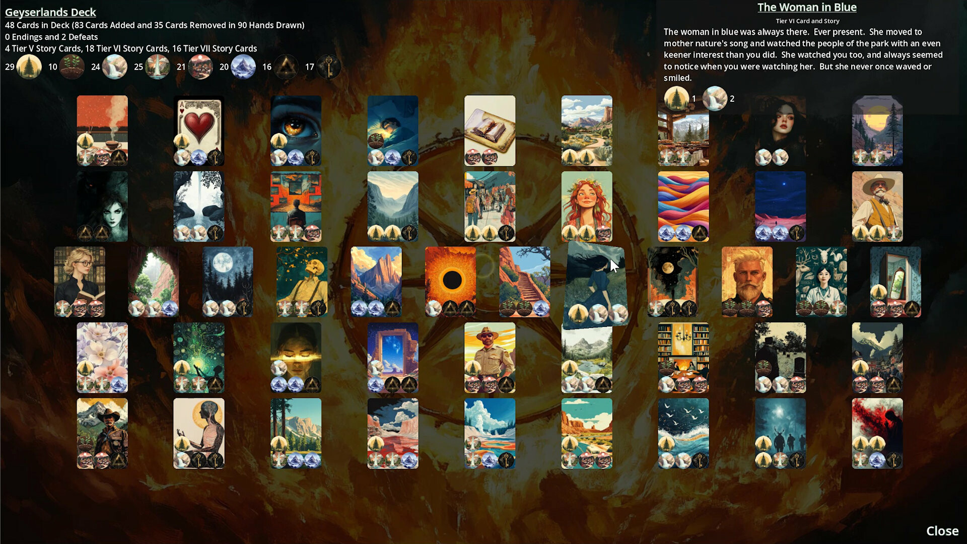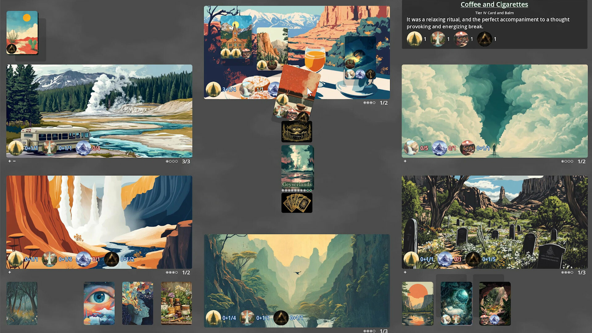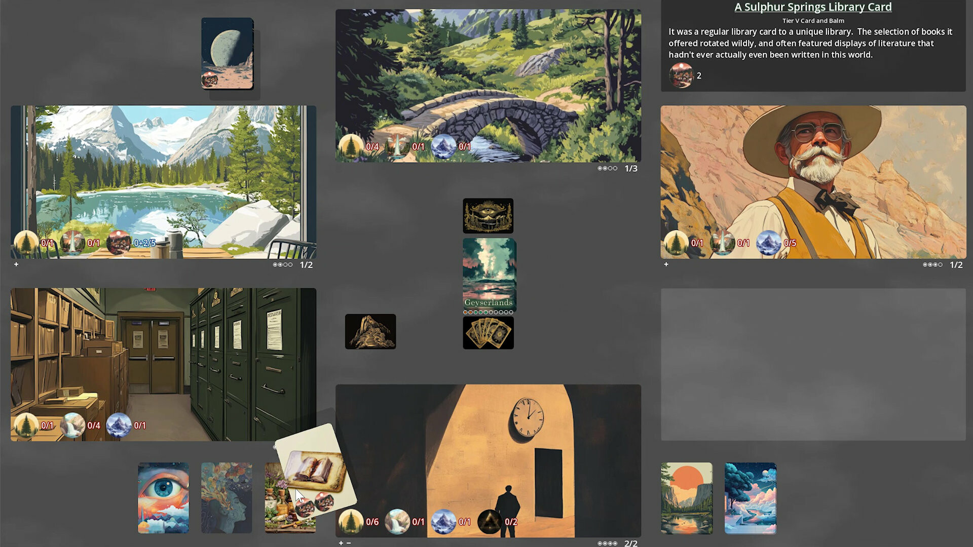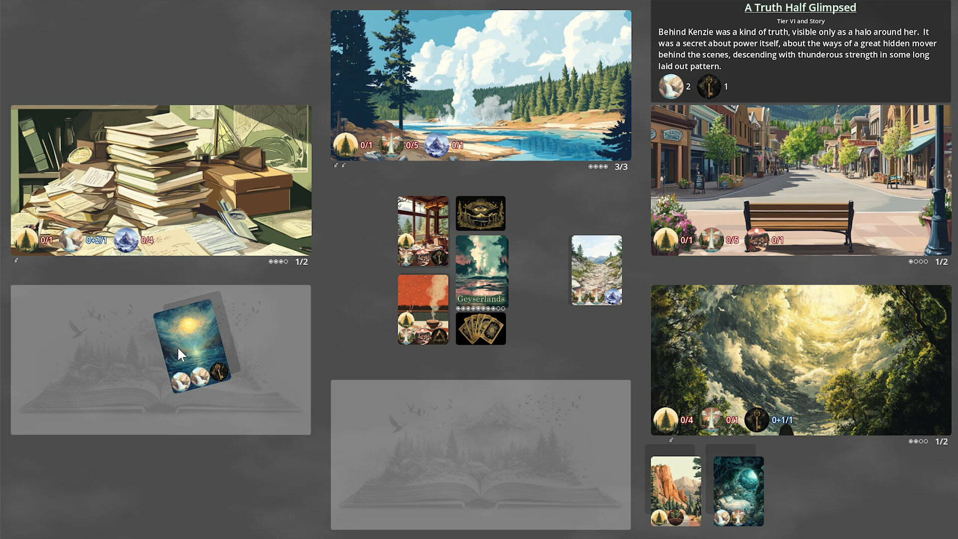 Geyserlands is a deck-building game of modern otherworldly mystery. You are a detective just assigned to a national park nobody knows exists. Gain new cards and upgrade your deck as you explore the mystery of Geyserlands. Unlock secret powers and gain special advantages. But delve too deep and Geyserlands will consume you. How will your story end in Geyserlands?