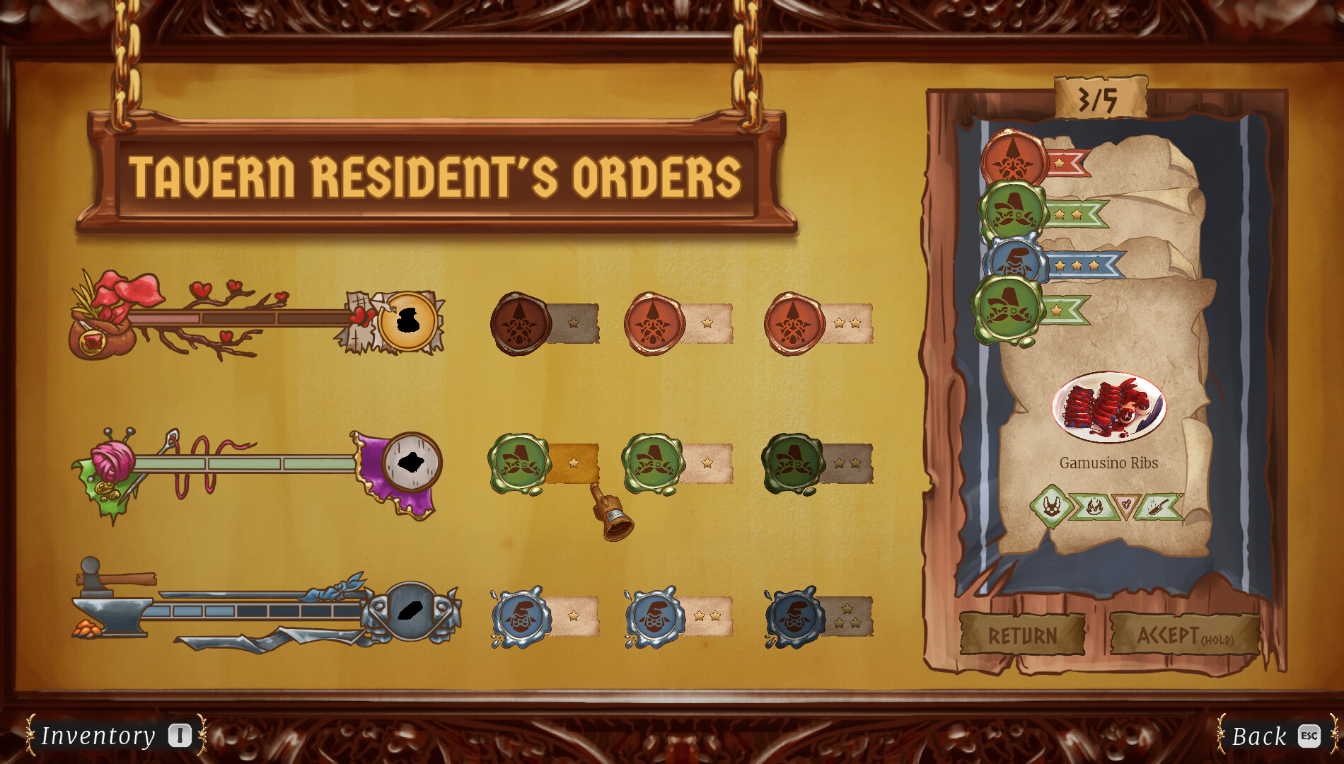 GHUNTER's tavern is equipped with a order board where he will be able to pick up dishes to the player's choosing. Once completed, you will submit it to gain satisfaction of said customer.