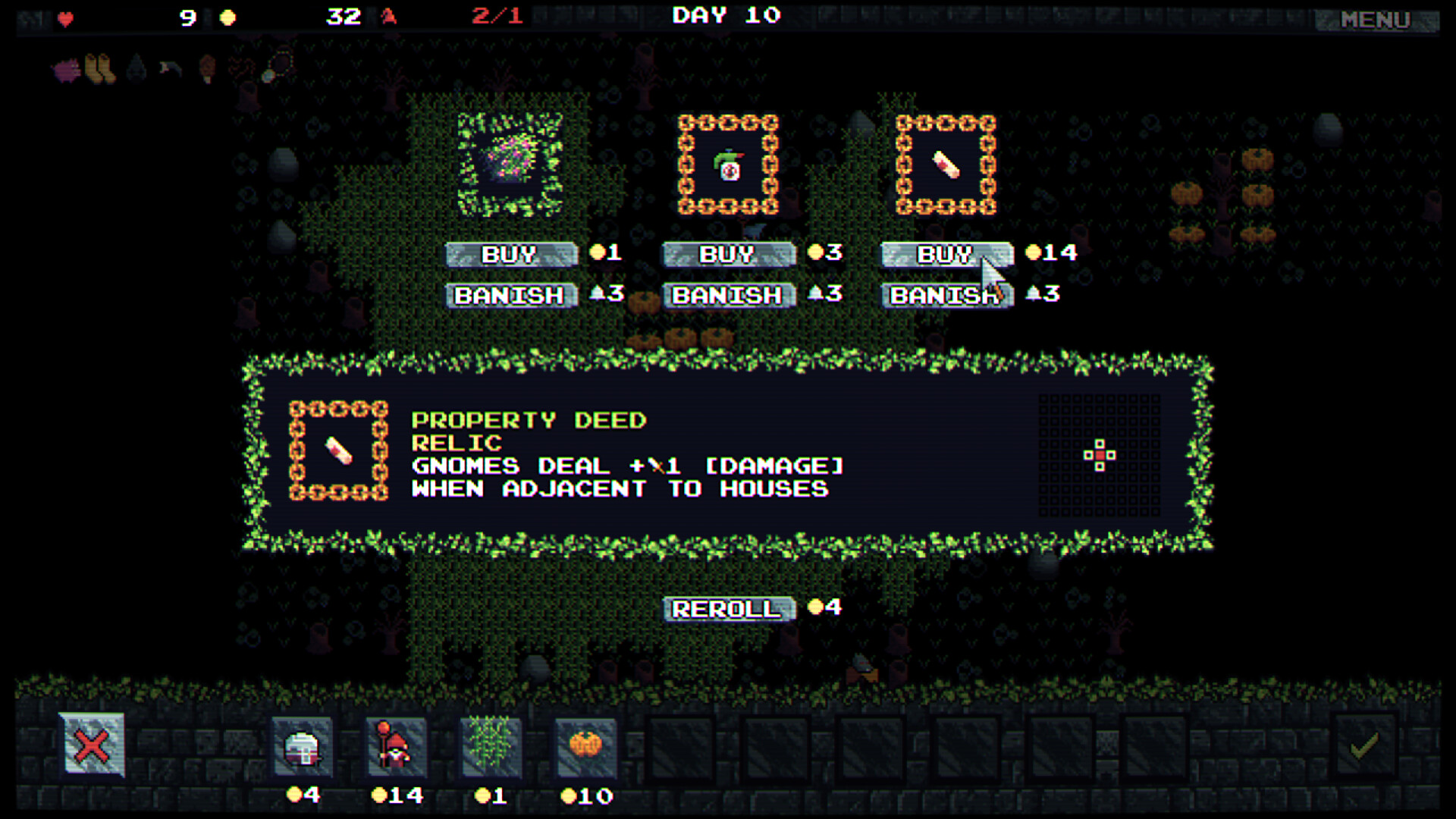 Every run in Gnomes is created one of a kind and using a carefully crafted combination of bespoke content and procedurally generated elements. Purchase randomly dealt upgrades and create strategic combinations to unlock your build’s potential. As you progress you gain access to more maps and guilds, each with unique gameplay and challenges.