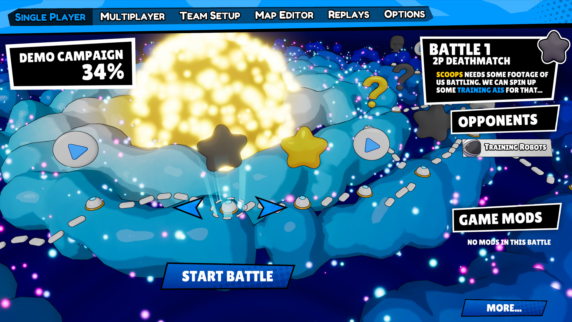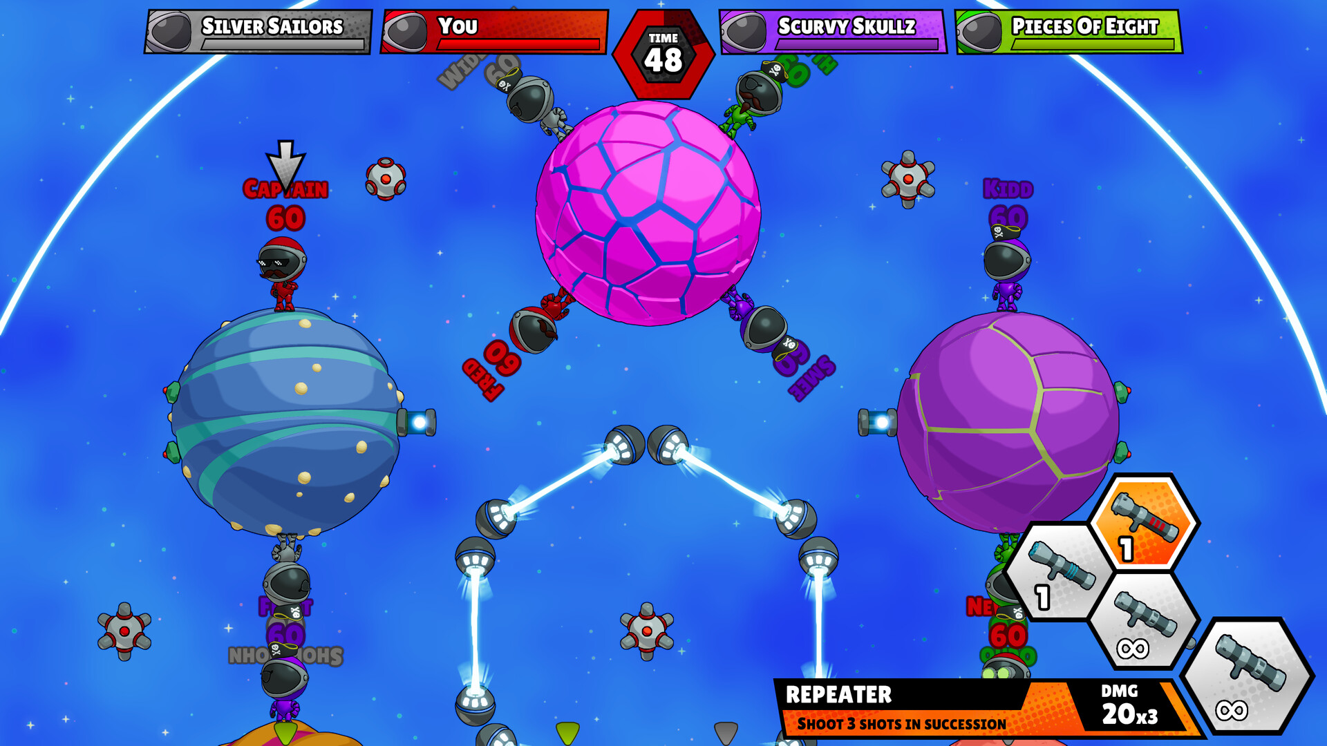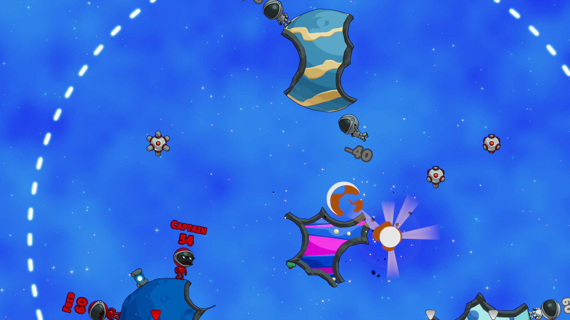 Battle across the galaxy in this turn-based space artillery game. Use the gravity of destructible planets to launch your shots at the enemy until only one team remains.Unlock new gear for your team members in the single player campaign and online multiplayer modes.
