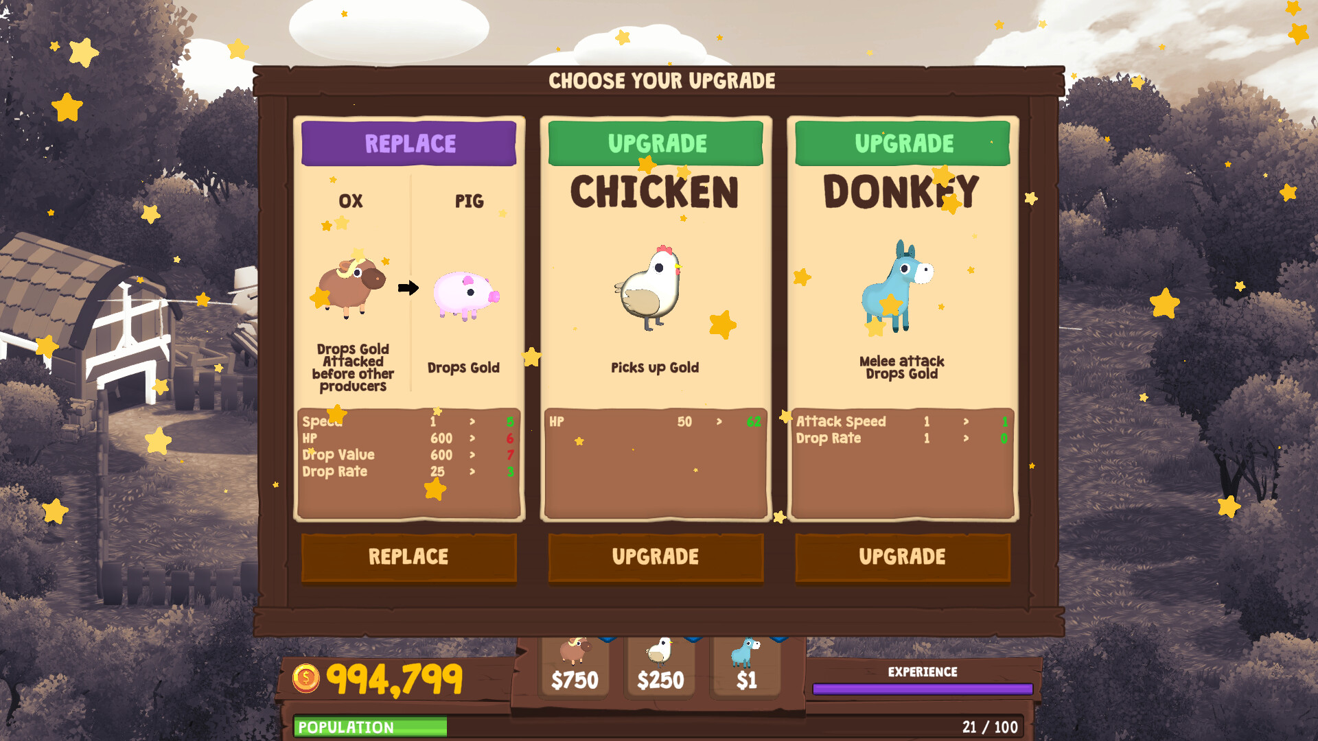 Some animals generate gold, others collect gold, and yet more can defend your herd. Every creature has a place on your farm.