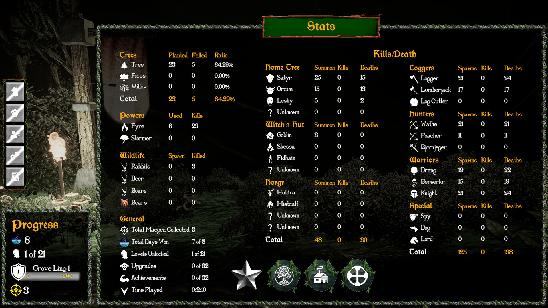 Grove Keeper takes you to an ancient, enchanted world inspired by Norse and Slavic mythology. You play the role of a Forest Deity protecting your Grove against an onslaught of loggers and poachers. Use your powers to grow trees, summon guardians, set traps, and employ magic to defend, and eventually conquer your human oppressors.