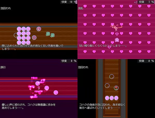 The evasion part involves action elements and aims to getting close to AWAYUKI before transitioning into the battle part, all while avoiding flying bubbles and hearts. In the battle segment, the goal is to use your skills to damage AWAYUKI while resisting her attacks and temptations.