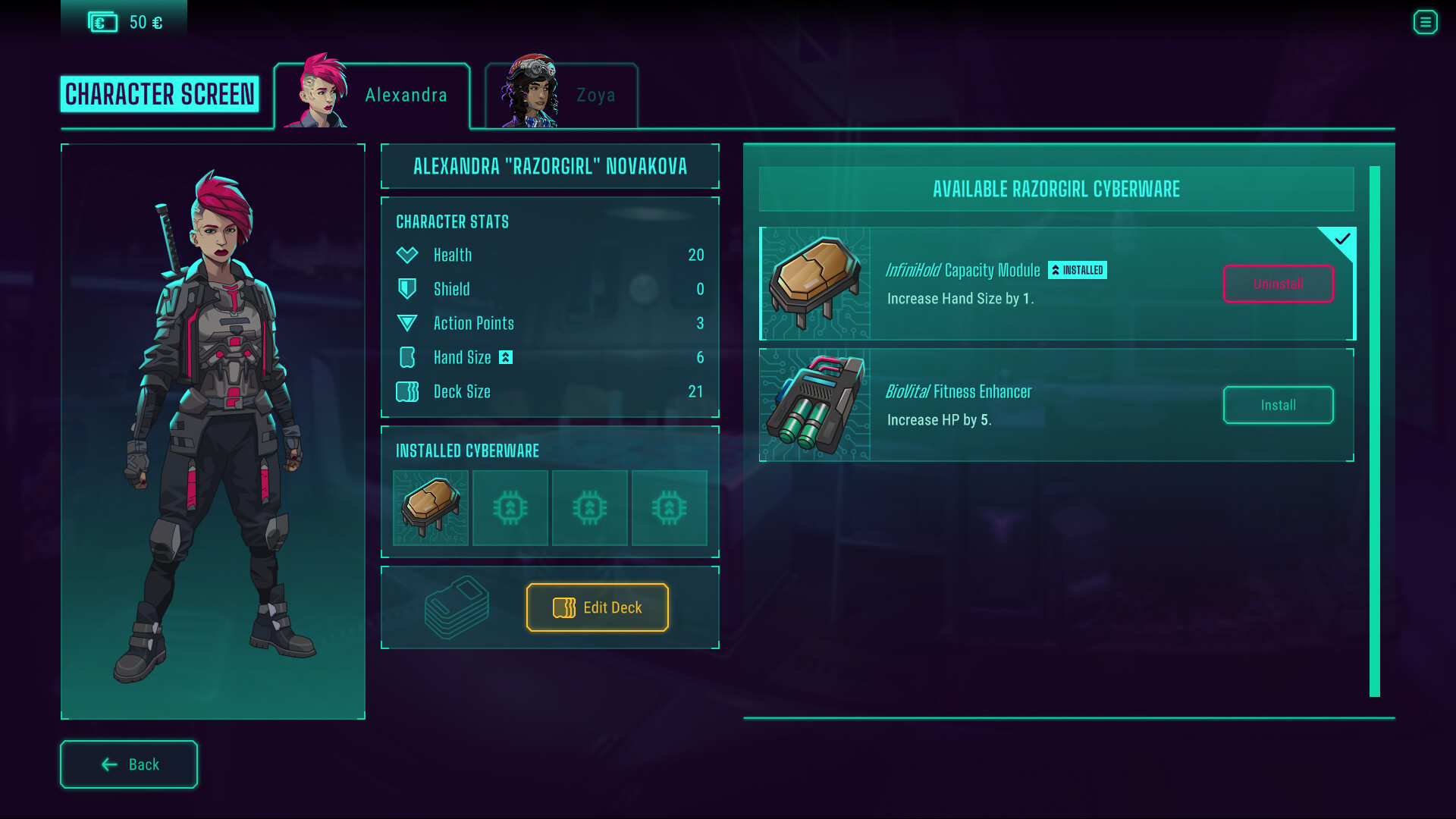 RPG - Build your character by constructing a deck of cards that suits your playstyle and by augmenting your character through the installation of cyberware that changes your attributes.