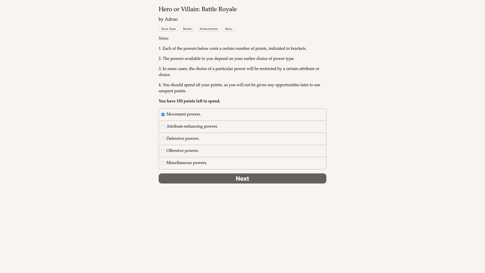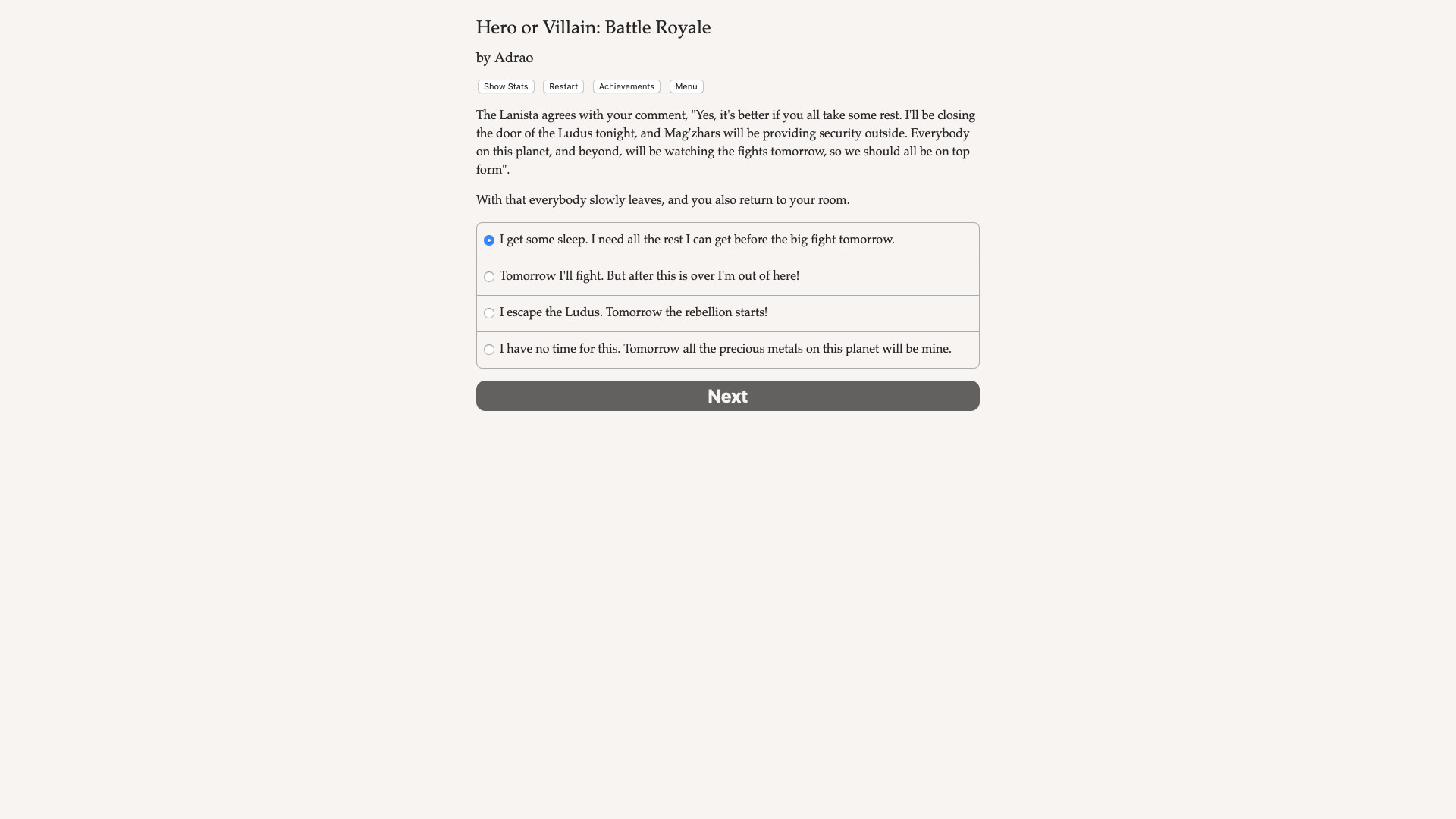 Hero or Villain: Battle Royale is a 290,000 word interactive novel by Adrao, where your choices control the story. The game is text-based, and while it has some artwork in it, your choices control entirely the outcome of the game.