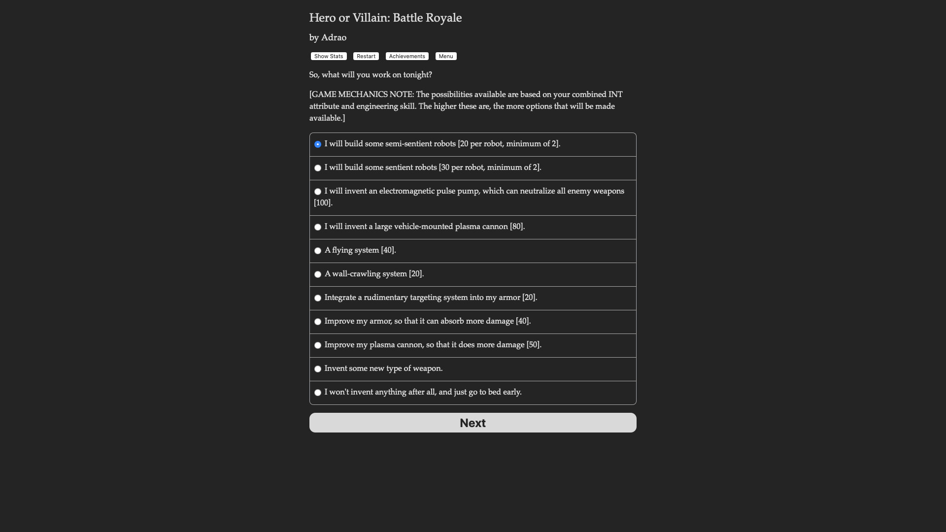 Hero or Villain: Battle Royale is a 290,000 word interactive novel by Adrao, where your choices control the story. The game is text-based, and while it has some artwork in it, your choices control entirely the outcome of the game.