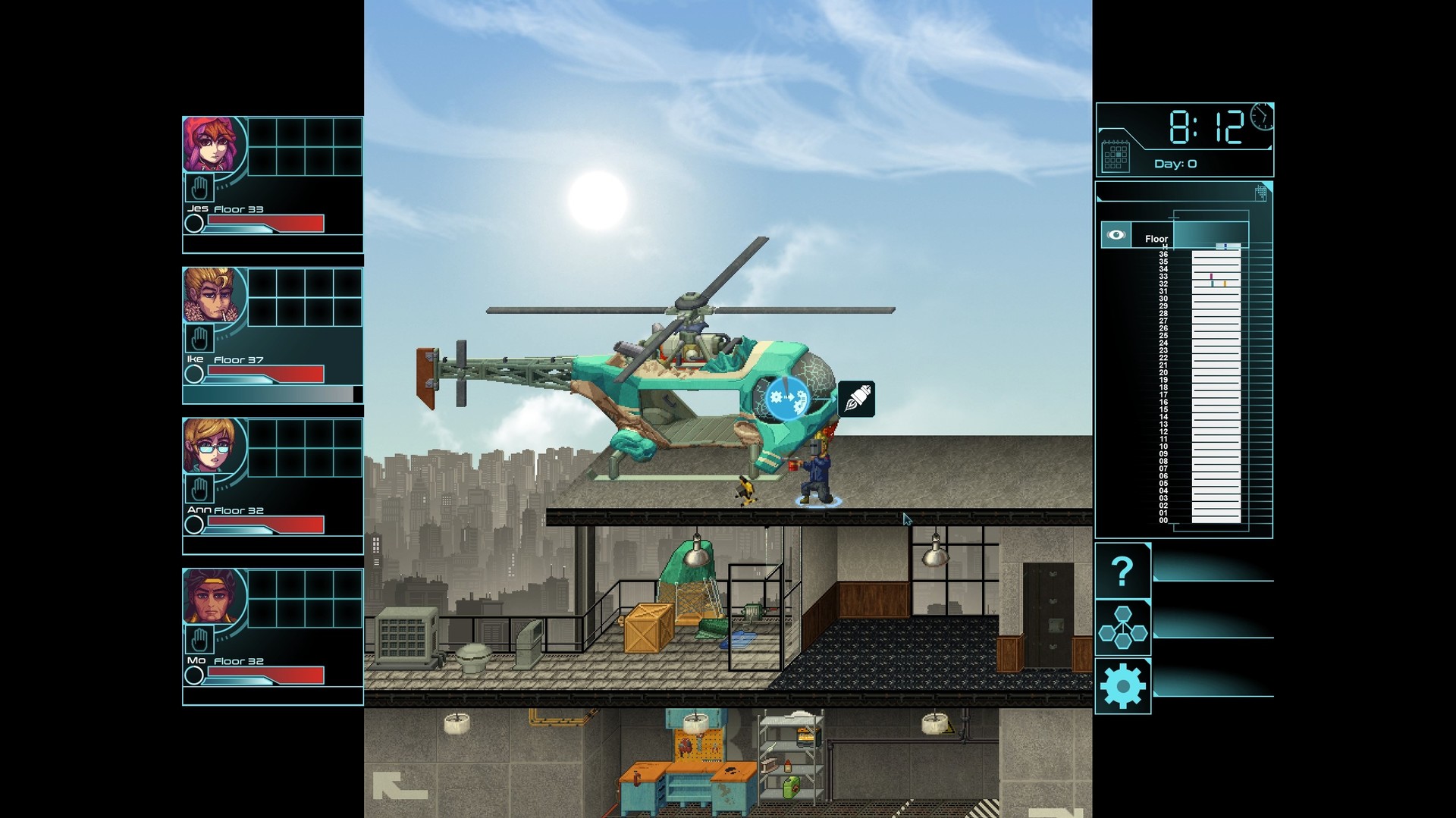 Luckily, the survivors can pool their resources, their skills and their knowledge. If they work together and combine their abilities, they increase their chances of survival tremendously. An old, crashed helicopter on the rooftop is their only chance. Although it will never reach full flight capabilities again, they can use it to jump from rooftop to rooftop, thus slowly making their way out of the city.