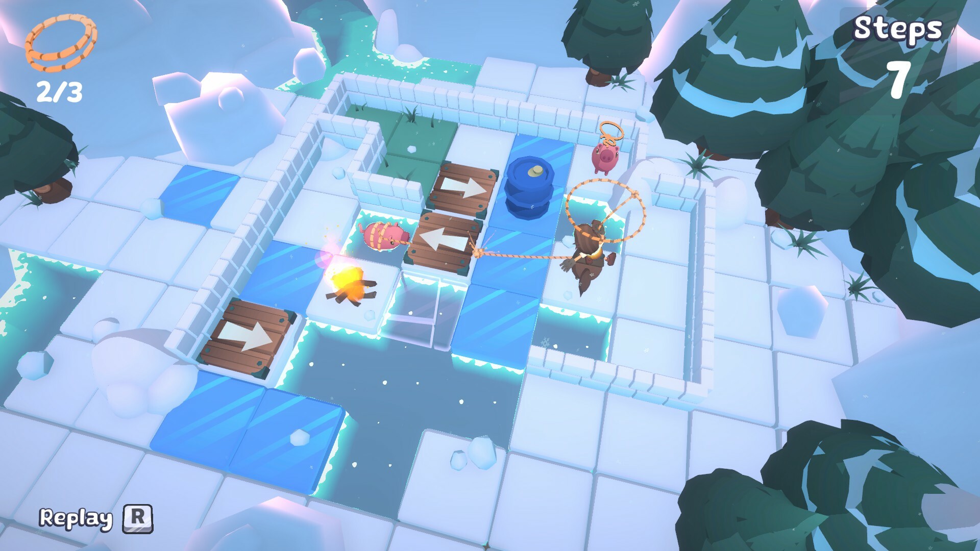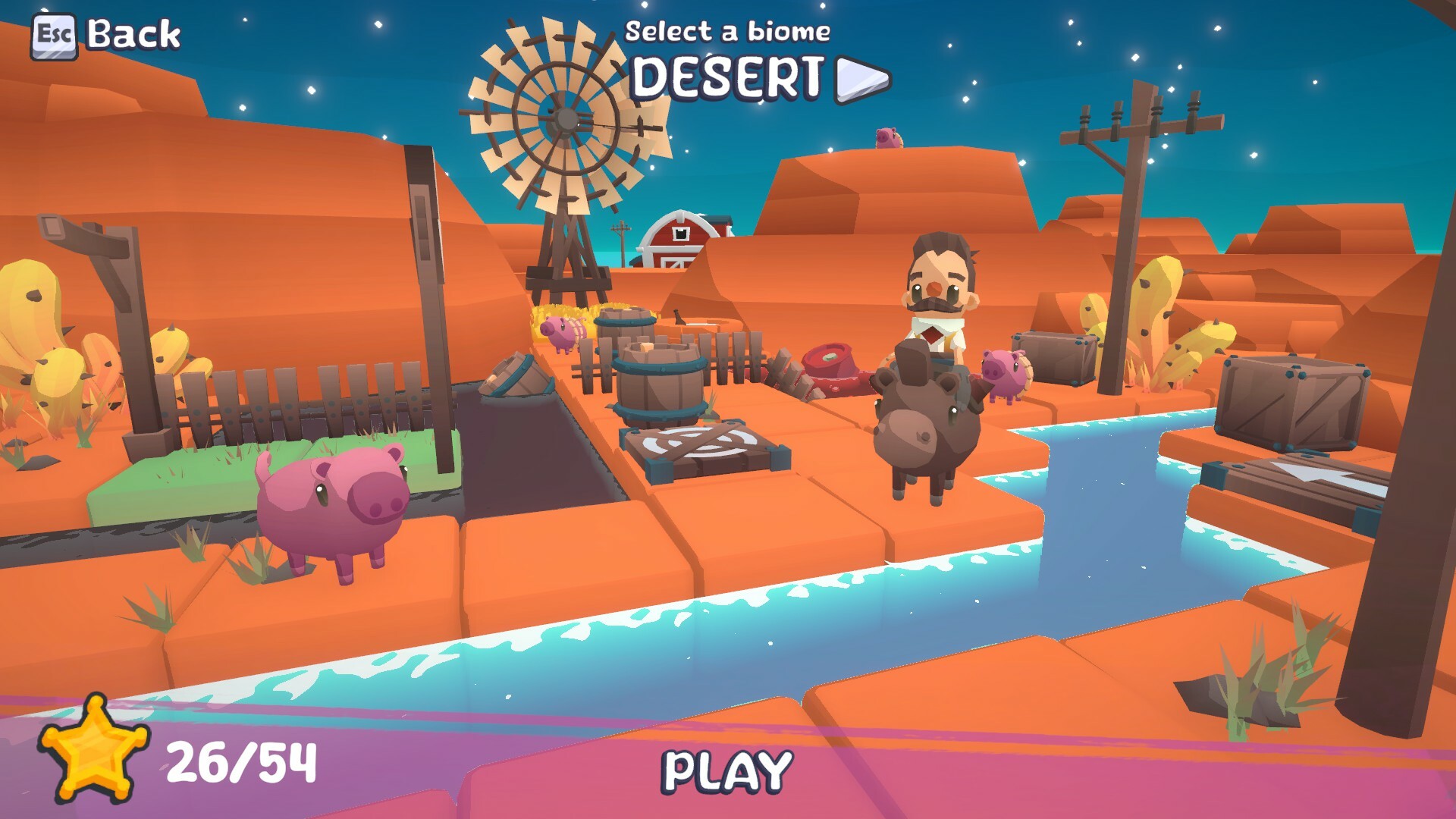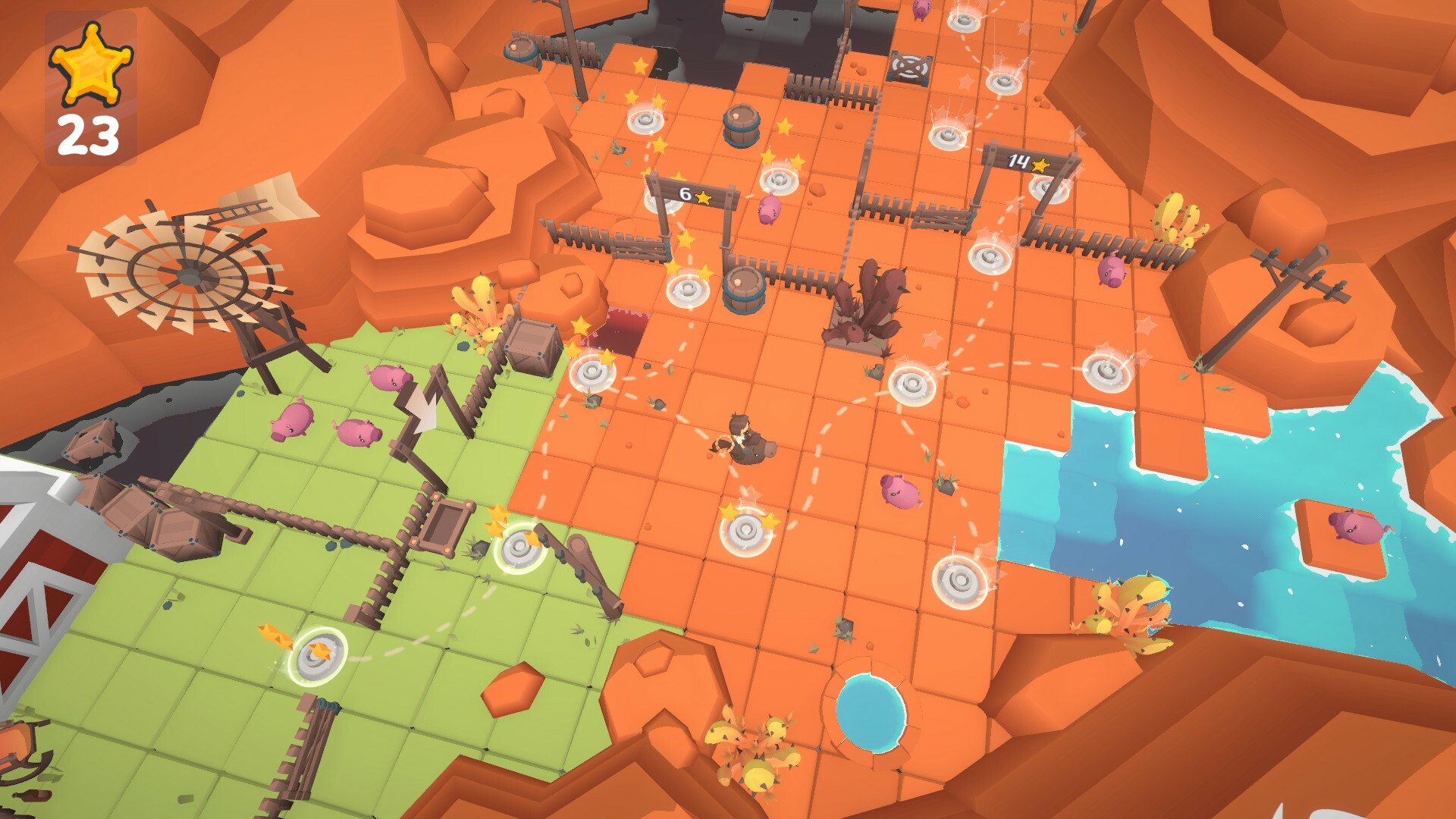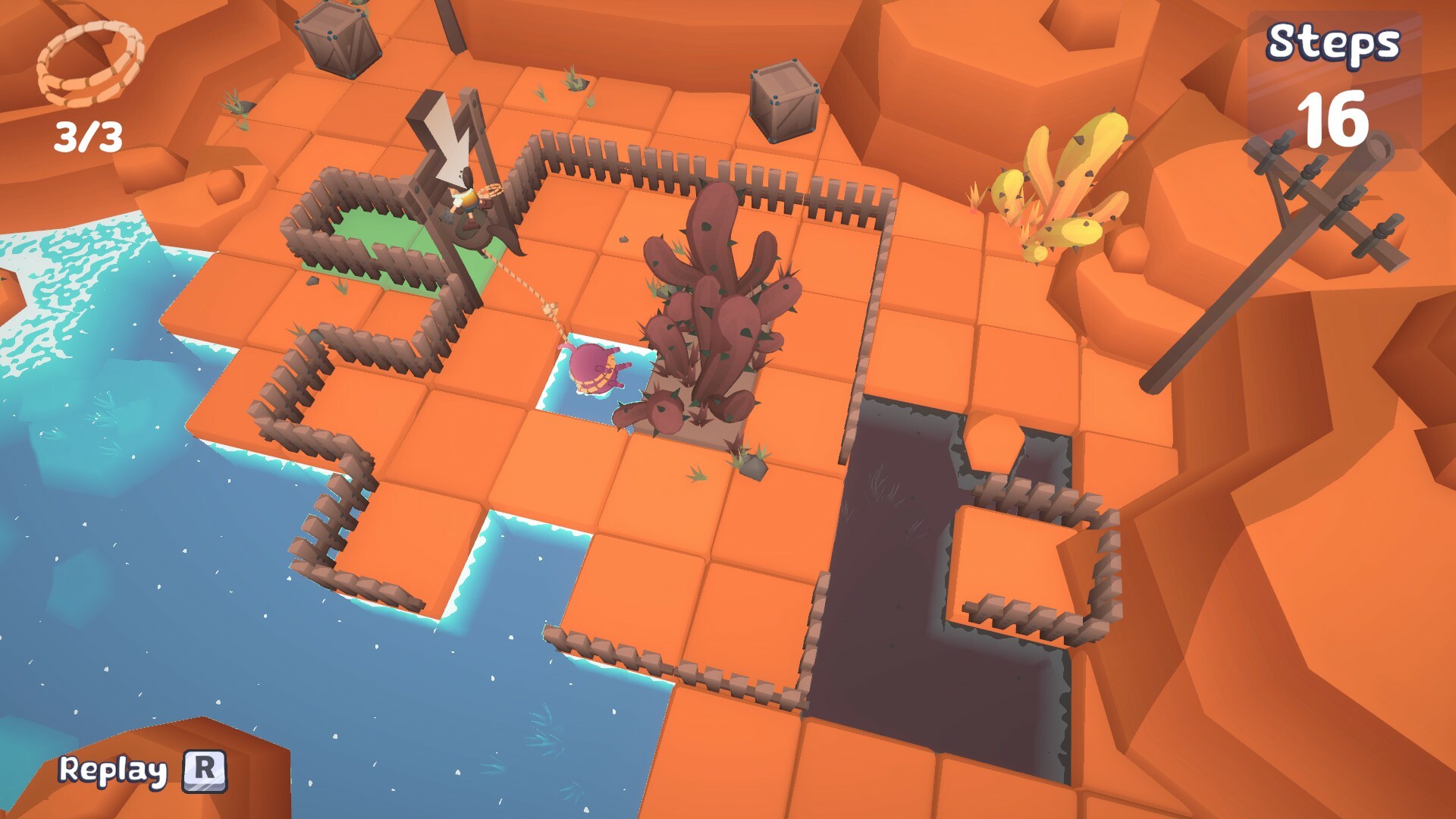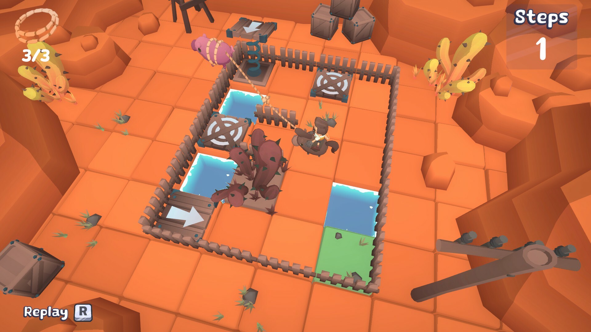 No Pushing in the Desert These piggies will not be pushed around—they need to be dragged along using your lasso, introducing a new twist to classic Sokoban puzzle mechanics.