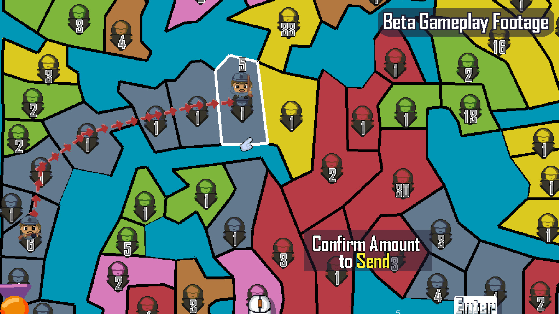 Home Before Winter is a turn-based, strategy game with a shoot'em up mini game. Feel the cold power of your Gatling gun rip through your enemy, mobilize your troops and send them to conquer adjacent territories, but be sure to save enough men for when the enemy sends out a counter-offensive. Complete objective cards to gain bonuses and help your men conquer the world!