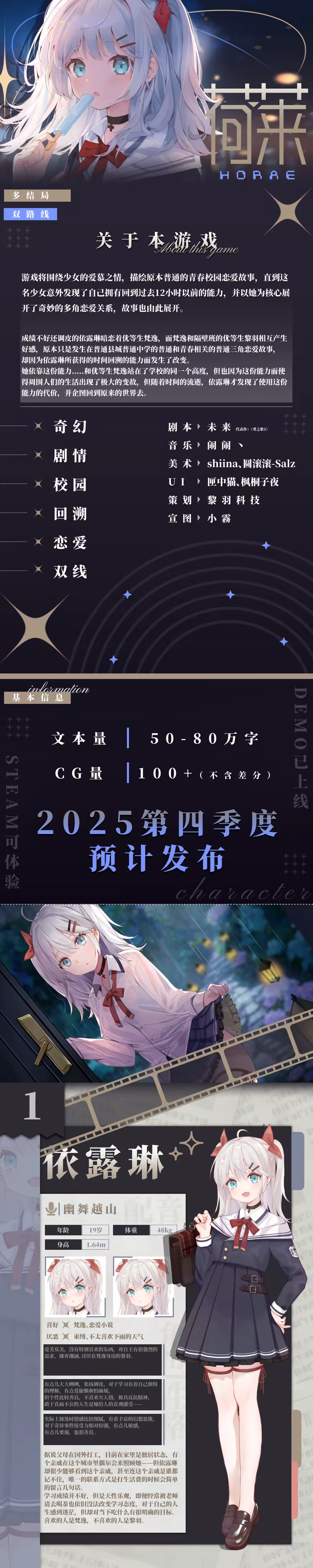 「荷莱」(Horae)是一款由北京黎羽科技制作并发行的买断制视觉小说游戏,游戏将围绕少女的爱慕之情,描绘原本普通的青春校园恋爱故事,直到这名少女意外发现了自己拥有回到过去12小时以前的能力,在谋求幸福的道路上,另一位少女爱上了她,并以她为核心展开了奇妙的多角恋爱关系,故事也由此展开,目前游戏正在开发中,未来在2025年会登陆Steam平台发布。