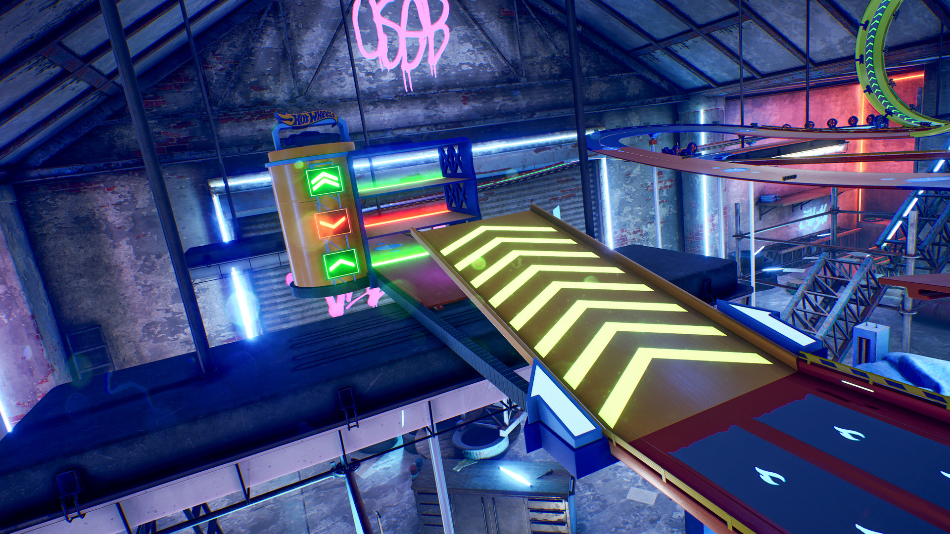 To win the race, you need to bring your game to the next level. And with the new Super Dealership module, you have not 1 but 3 levels to choose from! But be careful when you pick the one to land on. A mobile ramp will fly you to a different level of the module, activating a special effect indicated on the side of the building ... and not all of them will work to your advantage! Super-speed or slow effect? Your timing will decide the assigned effect and the fate of the race! It's time to take on the challenge and fly to the finish line! Add the Super Dealership module to your collection and create even more fun and unpredictable tracks!